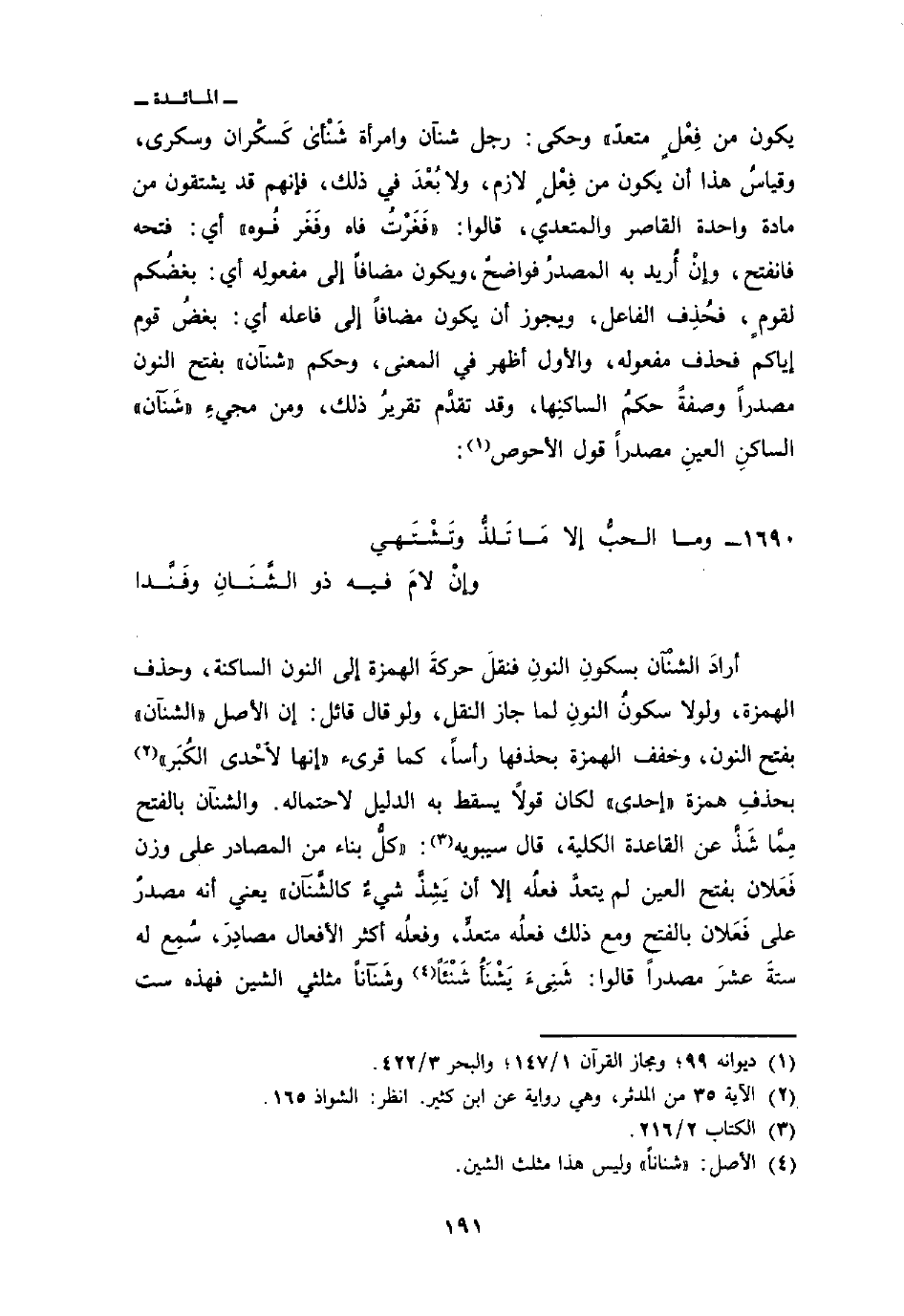 أراد الشنْآن بسكونِ النونِ فنقلَ حركةَ الهمزة إلى النون الساكنة، وحذف الهمزة، ولولا سكونُ النونِ لما جاز النقل، ولو قال قائل: إن الأصل «الشنآن» بفتح النون، وخفف الهمزة بحذفها رأساً، كما قرئ {إنها لاحْدى الكُبَر} [المدثر: 35] بحذفِ همزة «إحدى» لكان قولاً يسقط به الدليل لاحتماله. والشنآن بالفتح مِمَّا شَذَّ عن القاعدة الكلية، قال سيبويه: «كلُّ بناء من المصادر على وزن فَعَلان بفتح العين لم يتعدَّ فعلُه إلا أن يَشِذَّ شيءٌ كالشَّنآن» يعني أنه مصدرٌ على فَعَلان بالفتح ومع ذلك فعلُه متعدٍّ، وفعلُه أكثر الأفعال مصادِرَ، سُمِع له ستةَ عشرَ مصدراً قالوا: شَنِئَ يَشْنَأُ شَنْئَاً وشَنآناً مثلثي الشين فهذه ست