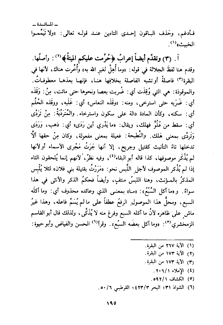 وتقدَّم أيضاً إعرابُ {حُرِّمَتْ عَلَيْكُمُ الميتة} : وأصلُها وقدم هنا لفظَ الجلالة في قوله: {وَمَآ أُهِلَّ بِهِ لِغَيْرِ الله} وأُخِّرت هناك، لأنها في البقرة فاصلةٌ أو تشبه الفاصلة بخلافِها هنا، فإنها بعدَها معطوفاتٌ. والموقوذة: هي التي وُقِذَت أي: ضُربت بعصا ونحوها حتى ماتت، مِنْ: وَقَذَه أي: ضَرَبه حتى استرخى، ومنه: «وقَذَه النعاس» أي: غَلَبه، ووقَذْه النعاس «أي: غَلَبه، ووقَذه الحُلُم أي: سكنه، وكأن المادة دالة على سكون واسترخاء. والمُتَرَدِّيَةُ: مِنْ تَرَدَّى أي: سقط من عُلُوٍّ فهلك، ويقال:» ما يَدْري أين رَدَى «أي: ذهب، وَرَدَى وَتَردَّى بمعنى هَلك، والنَّطيحة: فعيلة بمعنة مفعولة، وكان مِنْ حقها ألاَّ تدخلها تاءُ التأنيث كقتيل وجريح، إلا أنها جَرَتْ مَجْرى الأسماء أو لأنها لم يُذْكَر موصوفها، كذا قاله أبو البقاء، وفيه نظرٌ، لأنهم إنما يُلحقون التاء إذا لم يُذْكر الموصوف لأجلِ اللَّبس نحو:» مَرَرْتُ بقتيلة بن فلان «لئلا يُلْبِس المذكرُ بالمؤنث، وهنا اللبسُ منتفٍ، وأيضاً فحكمُ الذكر والأنثى في هذا سواءٌ. و» ما أكل السَّبُعُ «:» ما «بمعنى الذي وعائده محذوف أي: وما أكلَه السبع، ومحلُّ هذا الموصولِ الرفعُ عطفاً على ما لم يُسَمَّ فاعله، وهذا غيرُ ماشٍ على ظاهرة لأنَّ ما أكله السبع وفرغ منه لا يُذَكَّى، ولذلك قال أبو القاسم الزمخشري:» وما أكل بعضَه السبُع «وقرأ الحسن والفياض وأبو حيوة:»