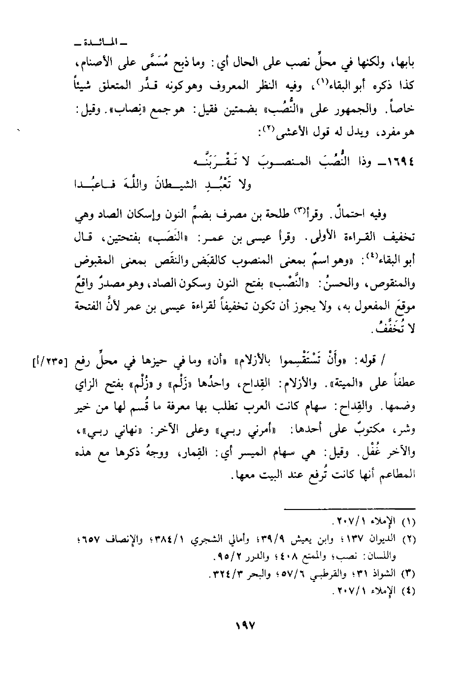 بابها، ولكنها في محلِّ نصب على الحال أي: وما ذبح مُسَمَّى على الأصنام، كذا ذكره أبو البقاء وفهي النظر المعروف وهو كونه قدَّر المتعلق شيئاً خاصاً. والجمهور على «النُّصُب» بضمتين فقيل: هو جمع «نِصاب» وقيل: هو مفرد، ويدل له قول الأعشى: