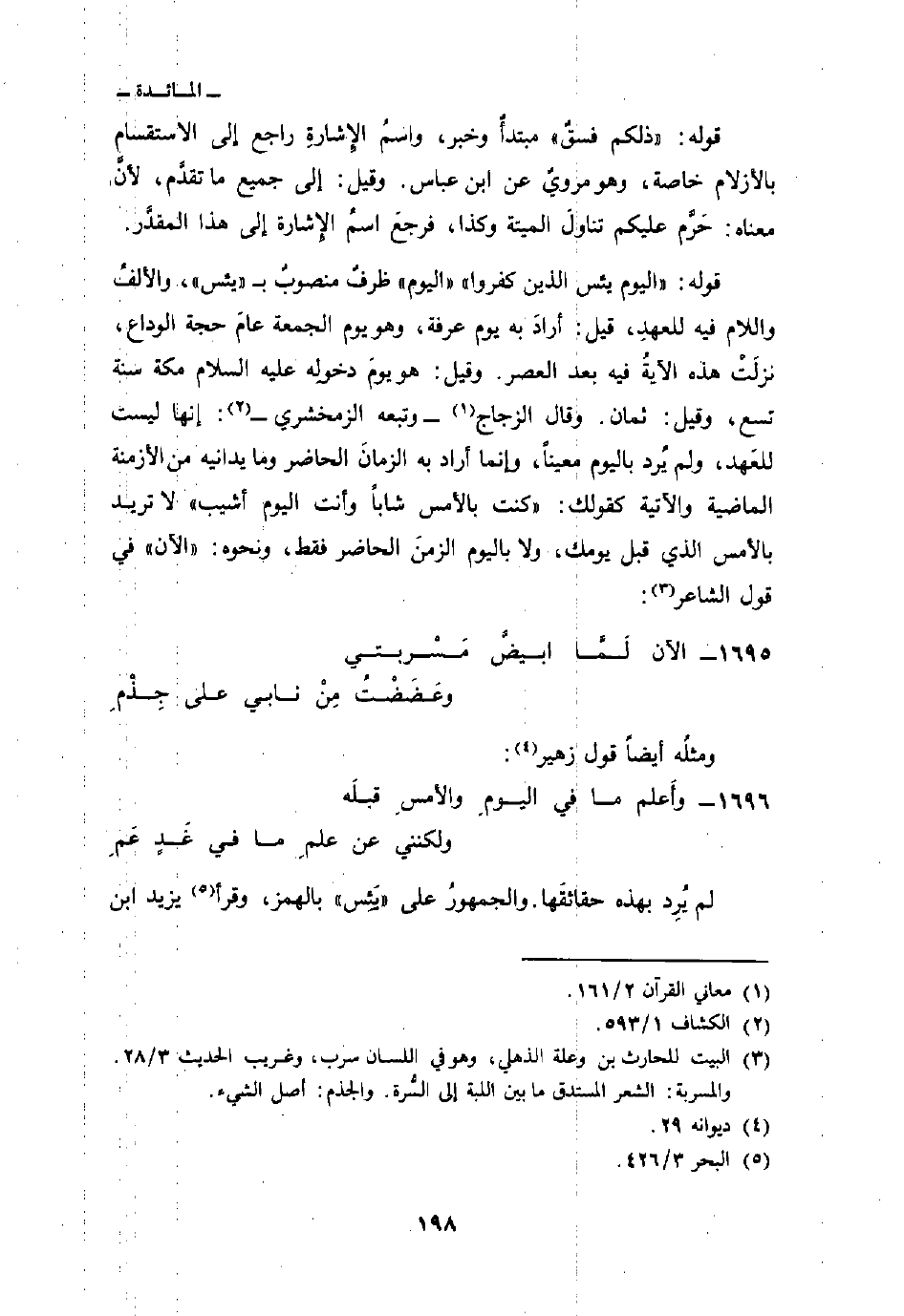 قوله: {اليوم يَئِسَ الذين كَفَرُواْ} » اليوم «ظرفٌ منصوبٌ ب» يئس «والألفُ واللام فيه للعهدِ، قيل: أرادَ به يوم عرفة، وهو يوم الجمعة عامَ حجة الوداع، نزلَتْ هذه الآيةُ فيه بعد العصر. وقيل: هو يومَ دخولِه عليه السلام مكة سنة تسع، وقيل: ثمان وقال الزجاج - وتبعه الزمخشري - إنها ليست للعَهد، ولم يُرد باليوم معيناً، وإنما أراد به الزمانَ الحاضر وما يدانيه من الأزمنة الماضية والآتية كقولك:» كنت بالأمس شاباً وأنت اليوم أشيب «لا تريد بالأمس الذي قبل يومك، ولا باليوم الزمنَ الحاضر فقط، ونحوه:» الآن «في قول الشاعر: