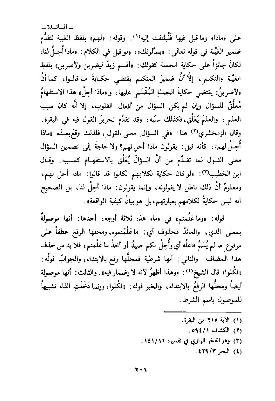 على «ماذا» وما قيل فيها فَلْيلتفت إليه. وقوله: «لهم» بلفظ الغيبة لتقدُّم ضمير الغَيْبة في قوله تعالى: {يَسْأَلُونَكَ} [البقرة: 215] ، ولو قيل في الكلام: «ماذا أُحِلَّ لنا» لكانَ جائزاً على حكاية الجملة كقولك: «أقسم زيدٌ ليضربن ولأضربن» بلفظِ الغَيْبة والتكلمِ، إلاَّ أنَّ ضميرَ المتكلم يقتضي حكايةَ ما قالوا، كما أنَّ «لأضربنَّ» يقتضي حكايةَ الجملةِ المُقْسَمِ عليها، و «ماذا أحِلَّ» هذا الاستفهامُ مُعلِّقٌ للسؤال وإن لم يكن السؤال من أفعال القلوب، إلا أنَّه كان سبب العلمِ، والعلمُ يُعَلَّق، فكذلك سبُبه، وقد تقدَّم تحريرُ القول فيه في البقرة. وقال الزمخشري هنا: «في السؤالِ معنى القولِ، فلذلك وقعَ بعدَه» ماذا أُحِلَّ لهم «، كأنه قيل: يقولون ماذا أحل لهم؟ ولا حاجةَ إلى تضمين السؤال معنى القول لما تقدَّم من أنَّ السؤالَ يُعَلَّق بالاستفهام كمسببه. وقال ابن الخطيب:» لو كان حكاية لكلامِهم لكانوا قد قالوا: ماذا أحل لهم، ومعلومٌ أنَّ ذلك باطل لا يقولونه، وإنما يقولون: ماذا أحِلَّ لنا، بل الصحيح أنه ليس حكايةً لكلامهم بعبارتهم، بل هو بيانُ كيفية الواقعة «.