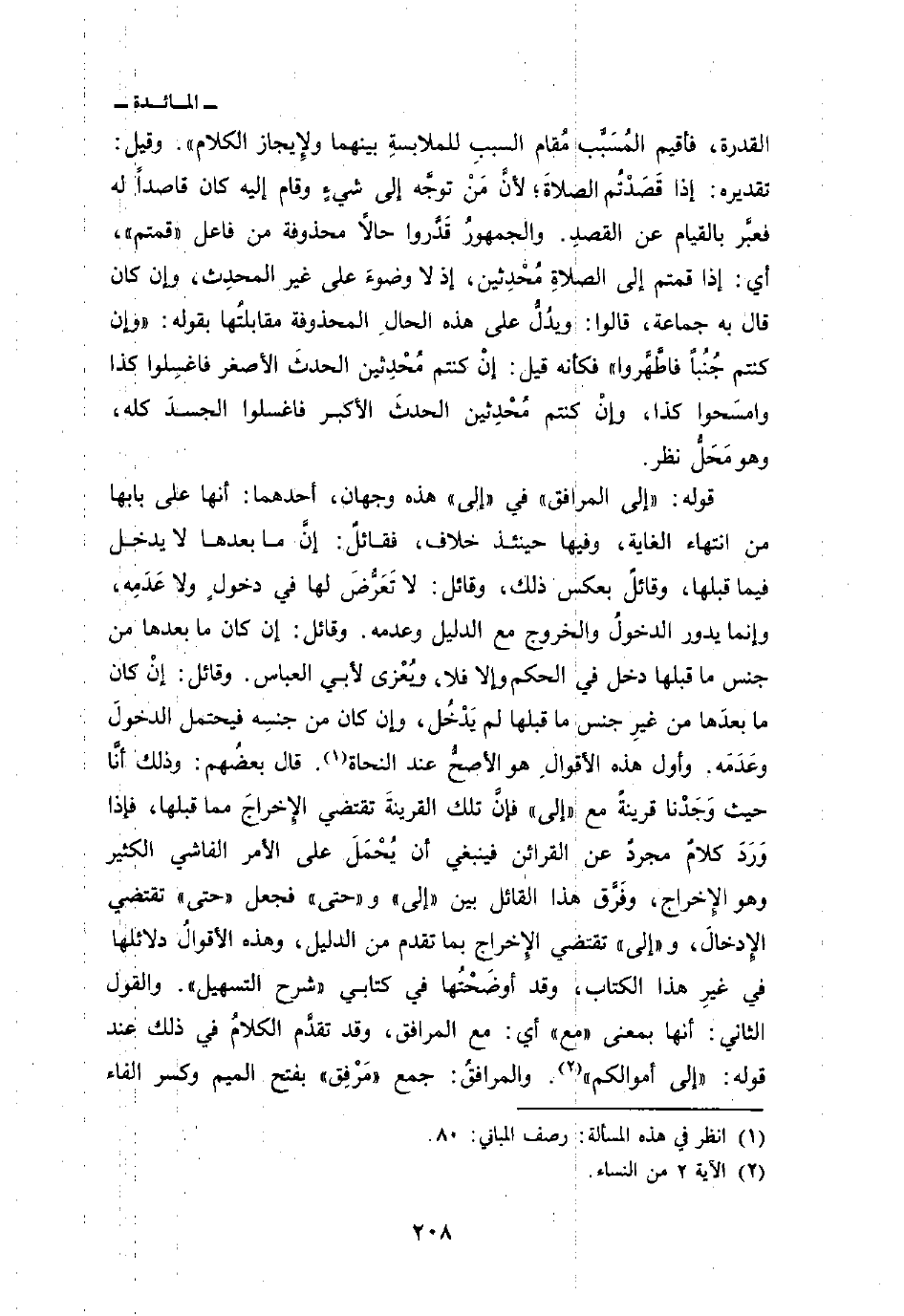 القدرة، فأقيم المُسَبَّب مُقام السببِ للملابسةِ بينهما ولإِيجاز الكلام «. وقيل: تقديره: إذا قَصَدْتُم الصلاةَ؛ لأنَّ مَنْ توجَّه إلى شيءٍ وقام إليه كان قاصدا له فعبَّر بالقيام عن القصدِ. والجمهورُ قَدَّروا حالاً محذوفة من فاعل» قمتم «، أي: إذا قمتم إلى الصلاةِ مُحْدِثين، إذ لا وضوءَ على غير المحِدث، وإن كان قال به جماعة، قالوا: ويدُلُّ على هذه الحالِ المحذوفة مقابلتُها بقوله: {وَإِن كُنتُمْ جُنُباً فاطهروا} فكأنه قيل: إنْ كنتم مُحْدِثين الحدثَ الأصغر فاغسِلو كذا وامسَحوا كذا، وإنْ كنتم مُحْدثين الحدثَ الأكبر فاغسلوا الجسدَ كله، وهو مَحَلُّ نظر.