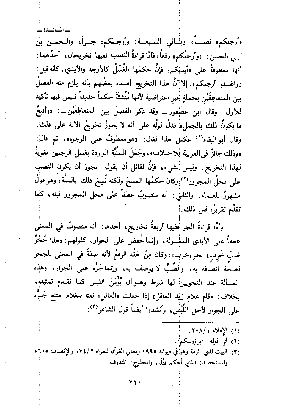 أرجلكم «نصباً، وباقي السبعة: وأرجلكم» جراً، والحسن بن أبي الحسن: «وأرجلُكم» رفعاً، فأمَّا قراءة النصب ففيها تخريجان، أحدُهما: أنها معطوفةٌ على «ايديكم» فإنَّ حكمَها الغُسْلُ كالأوجه والأيدي، كأنه قيل: «واغسلوا أرجلكم» إلا أنَّ هذا التخريجَ أفسده بعضُهم بأنه يلزم منه الفصلُ بين المتعاطِفَيْنِ بجملةٍ غير اعتراضية لأنها مُنْشِئَةٌ حمكاً جديداً فليس فيها تأكيد للأول. وقال ابن عصفور- وقد ذكر الفصلَ بين المتعاطِفَيْن -: «وأقبحُ ما يكونُ ذلك بالجمل» فدلَّ قولُه على أنه لا يجوزُ تخريجُ الآية على ذلك. وقال أبو البقاء عكسَ هذا فقال: «وهو معطوفٌ على الوجوه» ثم قال «وذلك جائزٌ في العربية بلا خلاف» وجَعَلَ السنِّيَّة الواردة بغسل الرجلين مقويةً لهذا التخريج، وليس بشيء، فإنَّ لقائل أن يقول: يجوز أن يكون النصب على محلِّ المجرور وكان حكمُها المسحَ ولكن نُسِخ ذلك بالسنَّة وهو قولٌ مشهورٌ للعلماء. والثاني: أنه منصوبٌ عطفاً على محل المجرور قبله، كما تقدَّم تقريرُه قبل ذلك.