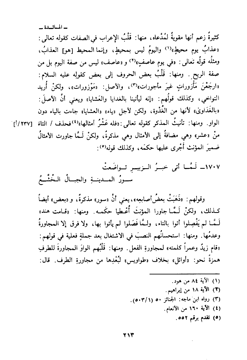 كثيرةً زعم أنها مقويةٌ لمُدَّعاه، منها: قَلْبُ الإِعراب في الصفات كقوله تعالى: {عَذَابَ يَوْمٍ مُّحِيطٍ} [هود: 84] واليومُ ليس بمحيطٍ، وإنما المحيط [هو] العذابُ، ومثلُه قولُه تعالى: {فِي يَوْمٍ عَاصِفٍ} [إبراهيم: 18] و «عاصف» ليس في صفة اليوم بل من صفة الريحِ. ومنها: قَلْبُ بعض الحروف إلى بعض كقول عليه السلام: «ارجَعْنَ مَأْزوارتٍ غيرَ مأجورات» والأصل: «مَوْزورات» ، ولكنْ أُريد التواخي، وكذلك قولُهم: «إنه ليأتينا بالغدايا والعَشايا» ويعني أنَّ الأصلَ: «بالغَدَاوى» لأنها من الغُدْوة، ولكن لأجل «ياء» العشايا «جاءت بالياء دون الواو. ومنها: تأنيثُ المذكر كقوله تعالى: