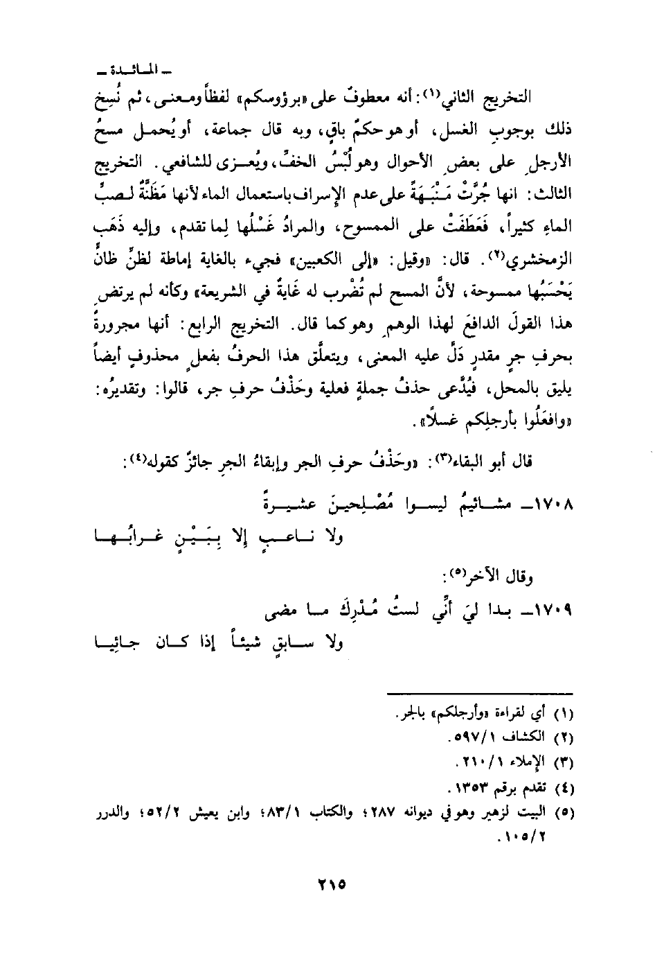 التخريج الثاني: أنه معطوفٌ على «برؤوسكم» لفظاً ومعنى، ثم نُسِخ ذلك بوجوبِ الغسل، أو هو حكمٌ باقٍ، وبه قال جماعة، أو يُحمل مسحُ الأرجلِ على بعضِ الأهوال وهو لُبْسُ الخفِّ، ويُعزى للشافعي. التخريج الثالث: انها جُرَّت مَنْبَهَةً على عدم الإِسراف باستعمال الماء لأنها مَظَنَّةٌ لصبِّ الماءِ كثيراً، فَعَطَفَتْ على الممسوح، والمرادُ غَسْلُها لِما تقدم، وإليه ذَهَب الزمخشري. قال: «وقيل:» إلى الكعبين «فجيء بالغاية إماطة لظنَّ ظانَّ يَحْسَبُها ممسوحة، لأنَّ المسح لم تُضْرب له غايةٌ في الشريعة» وكأنه لم ترتضِ هذا القول الدافعَ لهذا الوهمِ وهو كما قال. التخريج الرابع: أنها مجرورةٌ بحرفِ جرٍ مقدرٍ دَلَّ عليه المعنى، ويتعلَّق هذا الحرفُ بفعلٍ محذوفٍ أيضاً يليق بالمحل، فيُدَّعى حذفُ جملةٍ فعلية وحَذْفُ حرفِ جر، قالوا: وتقديرُه: «وافعَلُوا بأرجلِكم غسلاً» .