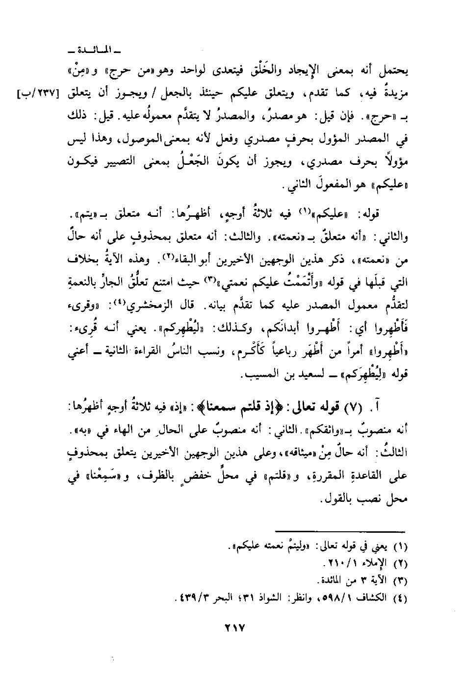 قوله: {عَلَيْكُم} فيه ثلاثةُ أوجهٍ، أظهرُها: أنه متعلق ب «يتم» . والثاني: «أنه متعلقٌ ب» نعمته «والثالث: أنه متعلق بمحذوفٍ على أنه حالٌ من» نعمته «ذكر هذين الوجهين الأخيرين أبو البقاء وهذه الآيةُ بخلاف التي قبلَها في قوله: {وَأَتْمَمْتُ عَلَيْكُمْ نِعْمَتِي} [المائدة: 3] حيث امتنع تعلُّقُ الجارِّ بالنعمةِ لتقدُّم معمول المصدر عليه كما تقدَّم بيانه. قال الزمخشري» وقرئ فَأَطْهِروا أي: أَطْهروا أبدانَكم، وكذلك: «ليُطْهِركم» يعين أنه قُرِئ: «أَطِهِروا» أمراً من أَطْهَر رباعياً كَأَكْرم، ونسب الناسُ القراءة الثانية - أعني قوله «لِيُطهِرَكم» لسعيد بن المسيب.