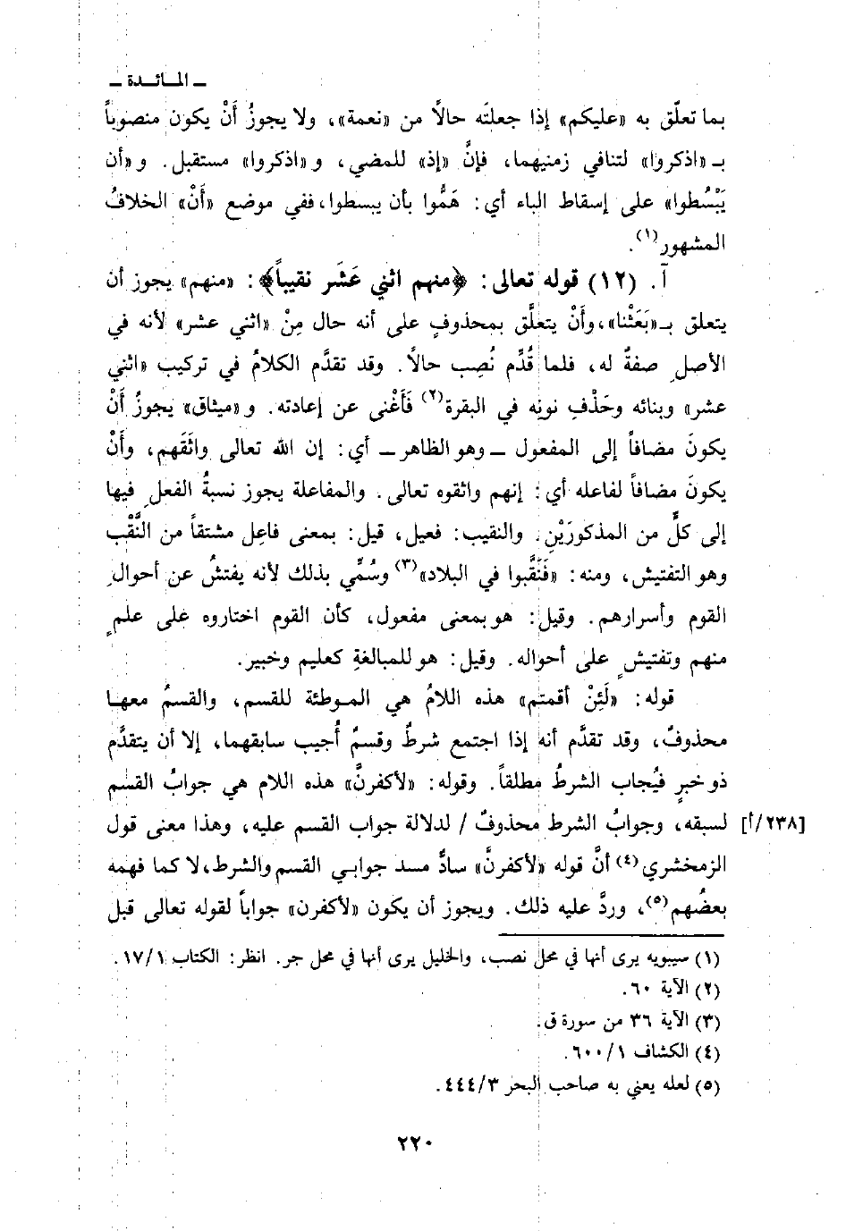 قوله تعالى: {مِنهُمُ اثني عَشَرَ نَقِيباً} : «منهم» يجوز أن يتعلق ب «بَعَثْنا» وأَنْ يتعلَّق بمحذوفٍ على أنه حال مِنْ «اثني عشر» لأنه في الأصلِ صفةُ له، فلما قُدُّمِ نُصِب حالاً. وقد تقدَّم الكلامُ في تركيب «اثني عشر» وبنائه وحَذْفِ نونِه في البقرة فَأَغْنى عن إعادته. و «ميثاق» يجوزُ أَنْ يكونَ مضافاً إلى المفعول - وهو الظاهر - أي: إن الله تعالى واثَقَهم، وأَنْ يكونَ مضافاً لفاعله: أي: إنهم واثقوه تعالى. والمفاعلة يجوز نسبةُ الفعلِ فيها إلى كلِّ من المذكورَيْنِ. والنقيب: فعيل، قيل: بمعنى فاعِل مشتقاً من النَّقْب وهو التفتيس، ومنه: {فَنَقَّبُواْ فِي البلاد} [ق: 36] وسُمِّي بذلك لأنه يفتشُ عن أحوالِ القوم وأسرارهم. وقيل: هو بمعنى مفعول، كأن القوم اختاره على علمٍ منهم تفتيشٍ على أحواله. وقيل: هو للمبالغةِ كعليم وخبير.
