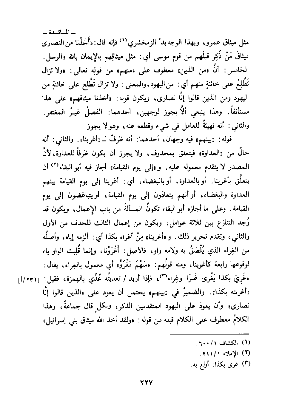 قوله: {بَيْنَهُمُ} فيه وجهان، أحدهما: أنه ظرفٌ ل «أغرينا» . والثاني: أنه حالٌ من «العداوة» فيتعلق بمحذوف، ولا يجوز أن يكون ظرفاً للعداوة، لأنَّ المصدر لا يتقدم معموله عليه. «وإلى يوم القيامة» أجاز فيه أبو البقاء أن يتعلَّق بأغرينا، أو بالعداوة، أو بالبغضاء، أي: أغرينا إلى يوم القيامة بينهم العداوة والبغضاء، أو أنهم يتعادَون إلى يوم القيامة، أو يتباغضون إلى يوم القيامة. وعلى مأ أجازه أبو البقاء تكونُ المسألةُ من باب الإعمال، ويكون قد وُجد التنازع بين ثلاثة عوامل، ويكون من إعمال الثالث للحذف من الأول والثاني، وتقدم تحرير ذلك. و «أغرينا» مِنْ أغراه بكذا أي: ألزمه إياه، وأصلُه من الغِراء الذي يُلْصَقُ به ولامه واو، فالأصل: أَغْرَوْنا، وإنما قُلِبت الواو ياء لوقوعها رابعة كأغوينا، ومنه قولُهم: «سَهْمٌ مَغْرُوُّ» أي معمول بالغِراء، يقال «غَرِيَ بكذا يَغْرى غَرَاء وغِراء، فإذا أريد / تعديتُه عُدِّي بالهمزة، فقيل:» أغريته بكذا «. والضميرُ في» بينهم «يحتمل أن يعود على» الذين قالوا إنَّا نصارى «وأن يعودَ على اليهود المتقدمين الذكر، وبكلٍ قال جماعةٌ، وهذا الكلامُ معطوف على الكلام قبله من قوله: {وَلَقَدْ أَخَذَ الله مِيثَاقَ بني إِسْرَآئِيلَ}