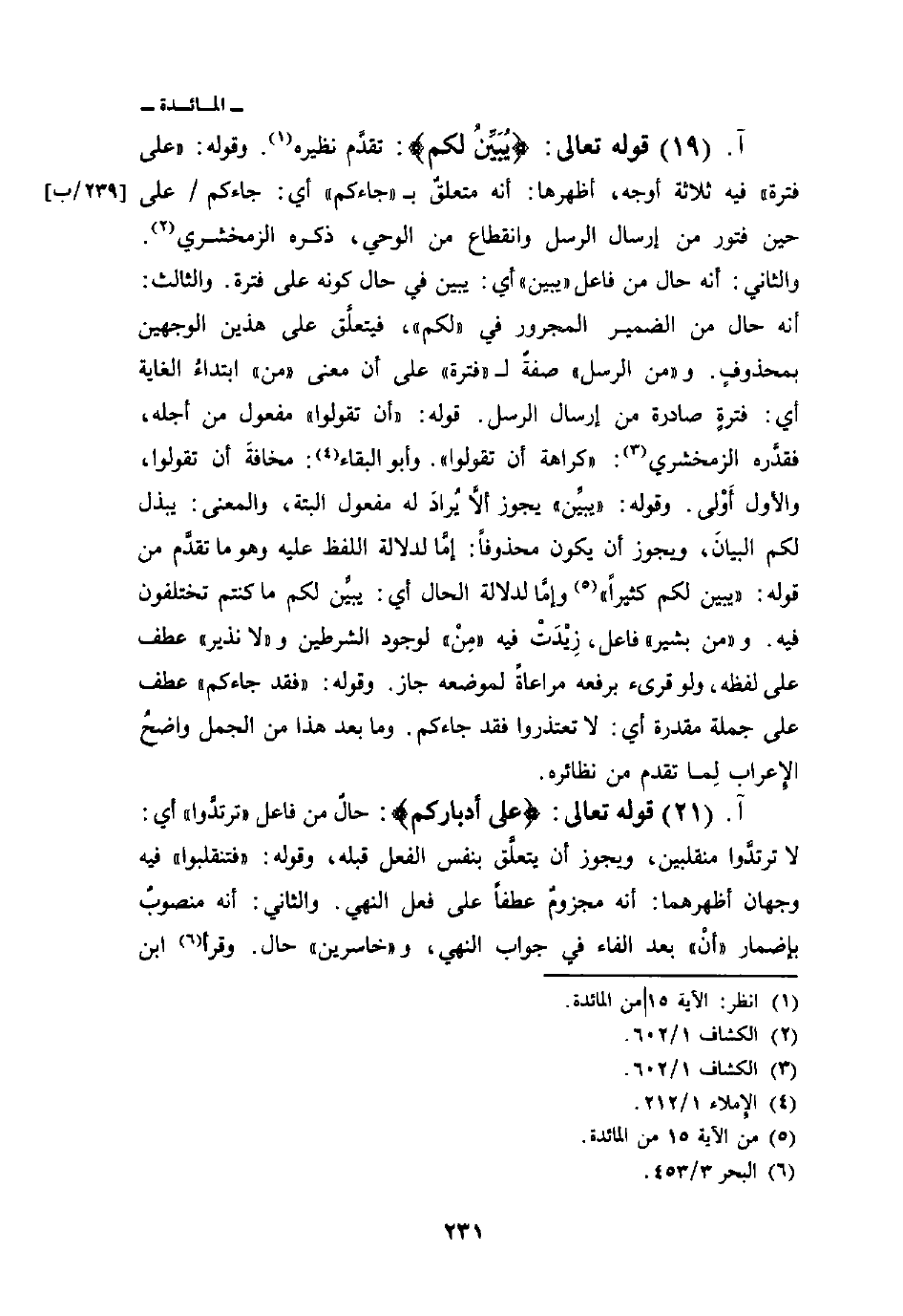 قوله تعالى: {يُبَيِّنُ لَكُمْ} : تقدَّم نظيره. وقوله: «على فترة» فيه ثلاثة أوجه، أظهرها: أنه متعلقٌ ب «جاءكم» أي: جاءكم / على حين فتور من إرسال الرسل وانقطاع من الوحي، ذكره الزمخشري والثاني: أنه حال من فاعل «يبين» أي: يبين في حال كونه على فترة. والثالث: أنه حال من الضمير المجرور في «لكم» فيتعلَّق على هذين الوجهين بمحذوفٍ. و «من الرسل» صفةٌ ل «فترة» على أن معنى «من» ابتداءُ الغاية أي: فترةٍ صادرة من إرسال الرسل. قوله: {أَن تَقُولُواْ} مفعول من أجله، فقدَّره الزمخشري: «كراهة أن تقولوا» وأبو البقاء: مخافةَ أن تقولوا، والأول أَوْلى. وقوله: «يبيِّن» يجوز ألاَّ يُرادَ له مفعول البتة، والمعنى: يبذل لكم البيانَ، ويجوز أن يكون محذوفاً: إمَّا لدلالة اللفظ عليه وهو ما تقدَّم من قوله: {يُبَيِّنُ لَكُمْ كَثِيراً} [المائدة: 15] وإمَّا لدلالة الحال أي: يبيِّن لكم ما كنتم تختلفون فيه. «ومن بشير» فاعل، زِيْدَتْ فيه «مِنْ» لوجود الشرطين و «لا نذير» عطف على لفظه، ولو قرئ برفعه مراعاةً لموضعه جاز. وقوله: {فَقَدْ جَاءَكُمْ} عطف على جملة مقدرة أي: لا تعتذروا فقد جاءكم. وما بعد هذا من الجمل واضحُ الإِعرابُ لِما تقدم من نظائره.