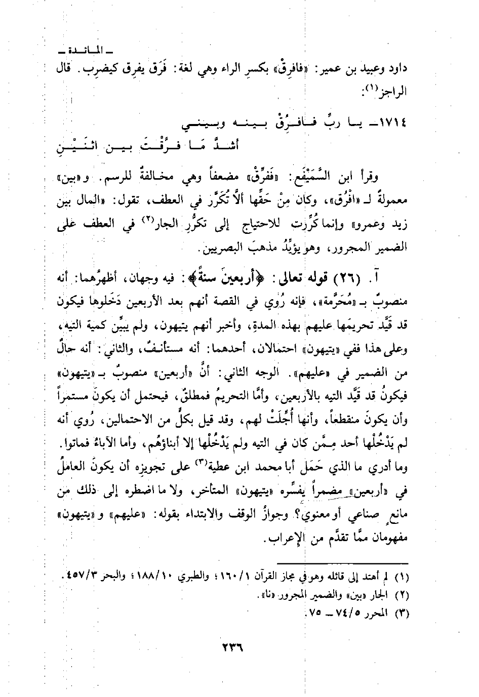 قوله تعالى: {أَرْبَعِينَ سَنَةً} : فيه وجهان، أظهرُهما: أنه منصوبٌ ب «مُحَرَّمة» فإنه رُوي في القصة أنهم بعد الأربعين دَخَلوها فيكون قد قَيَّد تحريمَها عليهم بهذه المدةِ، وأخبر أنهم يتيهون، ولم يبيِّن كمية التيه، وعلى هذا ففي «يتيهون» احتملان، أحدهما: أنه مستأنفٌ، والثاني: أنه حالٌ من الضمير في «عليهم» الوجه الثاني: أنَّ «أربعين» منصوبٌ ب «يتيهون» فيكونُ قد قَيَّد التيه بالأربعين، وأمَّا التحريمُ فمطلقٌ، فيحتمل أن يكونَ مستمراً وأن يكونَ منقطعاً، وأنها أُجِّلتْ لهم، وقد قيل بكلِّ من الاحتمالين، رُوي أنه لم يَدْخُلْها أحد مِمَّن كان في التيه ولم يَدْخُلْها إلا أبناؤهُم، وأما الآباءُ فماتوا. وما أدري ما الذي حَمَل أبا محمد ابن عطية على تجويزِه أن يكونَ العاملُ في «أربعين» مضمراً يفسِّره «يتيهون» المتأخر، ولا ما اضطره إلى ذلك من مانعٍ صناعي أو معنوي؟ وجوازُ الوقف والابتداء بقوله: «عليهم» و «يتيهون» مفهومان ممَّا تقدَّم من الإِعراب.
