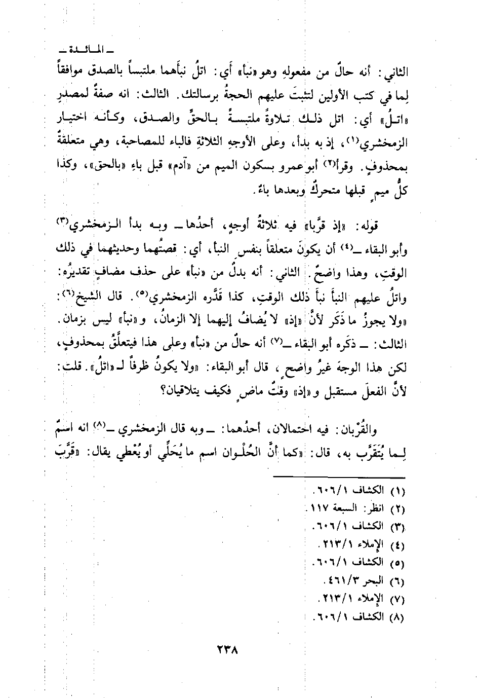 الثاني: أنه حالٌ من مفعولِه وهو «نبأ» أي: اتلُ نبأَهما ملتبساً بالصدق موافقاً لِما في كتب الأولين لتثبتَ عليهم الحجةُ برسالتك. الثالث: أنه صفةٌ لمصدرِ «اتلُ» أي: اتل ذلك تلاوةً ملتبسةً بالحقِّ والصدق، وكأنه اختيار الزمخشري إذ به بدأ، وعلى الأوجهِ الثلاثةِ فالباء للمصاحبة، وهي متعلقةٌ بمحذوفٍ. وقرأ أبو عمرو بسكون الميم من «آدم» قبل باءِ «بالحق» ، وكذا كلُّ ميمٍ قبلها متحركٌ وبعدها باءٌ.