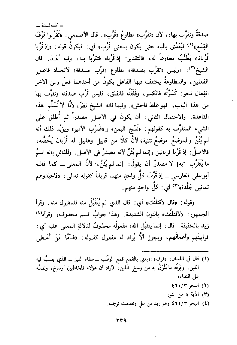 صدقةً وتقرَّب بها «لأن» تقرَّب «مطاوعُ» قَرَّب «قال الأصمعي:» تَقَرَّبوا قِرْفَ القِمَع «فيُعَدَّى بالباء حتى يكون بمعنى قَرَّب» أي: فيكونُ قوله: {إِذْ قَرَّبَا قُرْبَاناً} يَطْلُبُ مطاوعاً له، فالتقدير: إذ قَرَّباه فتقرَّبا به، وفيه بُعْدٌ. قال الشيخ: «وليس» تقرَّب بصدقة «مطاوع» قَرَّب صدقة «لاتحاد فاعلِ الفعلين، والمطاوعةُ يختلف فيها الفاعل يكونُ من أحدِهما فعلٌ ومن الآخر انفِعال نحو: كَسَرْتُه فانكسر وفَلَقْتُه فانقلق، فليس قَرَّب صدقته وتقرَّب بها من هذا الباب، فهو غلط فاحش» . وفيما قاله الشيخ نظرٌ، لأنَّا لا نسَلِّم هذه القاعدة. والاحتمال الثاني: أن يكونَ في الأصلِ مصدراً ثم أُطلق على الشيء المتقرَّب به كقولهم: «نَسْج اليمن» و «ضَرْب الأمير» ويؤيِّد ذلك أنه لم يُثَنَّ والموضعُ موضعُ تثنية؛ لأنَّ كلاً من قابيل وهابيل له قُرْبان يَخُصُّه، فالأصلُ: إذ قَرَّبا قربانين وإنما لم يُثَنَّ لأنه مصدرٌ في الأصل. وللقائل بانه اسمُ ما يُتَقَرَّب [به] لا مصدرٌ أن يقولَ: إنما لم يُثَنَّ،.