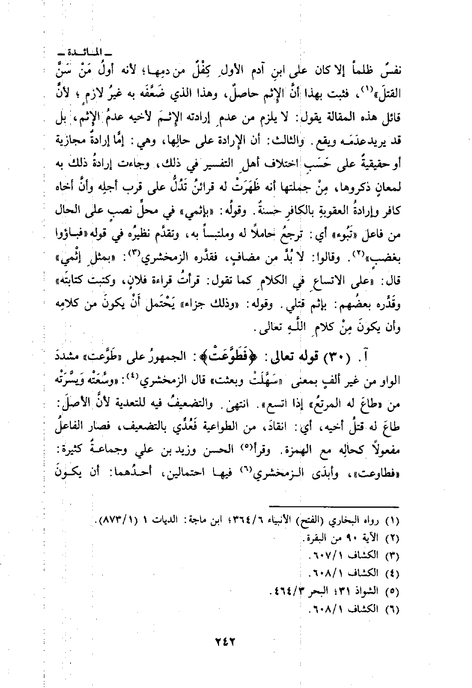 قوله تعالى: {فَطَوَّعَتْ} : الجمهورُ على «طَوَّعت» مشددَ الواو من غير ألفٍ بمعنى «سَهَّلَتْ وبعثت» قال الزمخشري: «وسَّعَتْه وَيسَّرَتْه من» طاع له المرتعُ «إذا اتسع» انتهى. والتضعيفُ فيه للتعدية لأنَّ الأصلَ: طاعَ له قتلُ أخيه، أي: انقادَ، من الطواعية فَعُدِّي بالتضعيف، فصار الفاعلُ مفعولاً كحالِه مع الهمزة. وقرأ الحسن وزيد بن علي وجماعةٌ كثيرة: «فطاوعت» ، وأبدَى الزمخشري فيها احتمالين، أحدُهما: أن يكونَ