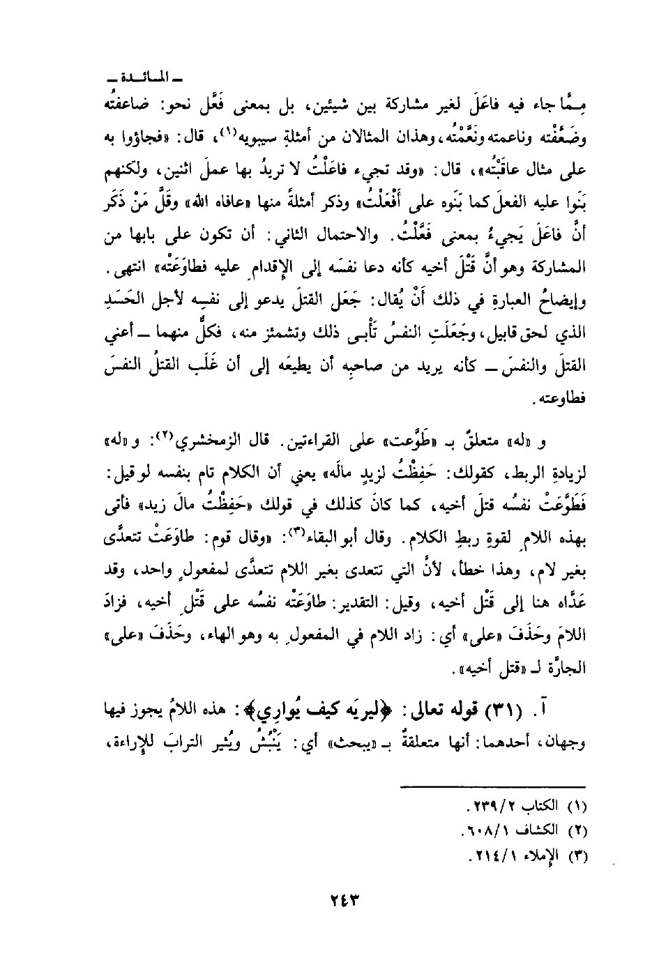 مِمَّا جاء فيه فاعَلَ لغير مشاركه بين شيئين، بل بمعنى فَعَّل نحو: ضاعفتُه وضَعَّفْته وناعمته ونَعَمْتُه، وهذان المثالان من أمثلةِ سيبويه، قال: «فجاؤوا به على مثال عاقَبْتُه» قال: «وقد تجيء فاعَلْتُ لا تريد بها عملَ اثنين، ولكنهم بَنَوا عليه الفعلَ كما بَنَوه على أَفْعَلْتُ» وذكر أمثلةً منها «عافاه الله» وقَلَّ مَنْ ذَكَر أنَّ فاعَلَ يَجيءُ بمعنى فَعَّلْتُ. والاحتمال الثاني: أن تكن على بابها من المشاركة وهو أنَّ قَتْلَ أخيه كأنه دعا نفسَه إلى الإِقدامِ عليه فطاوَعَتْه «انتهى. وإيضاحُ العبارةِ في ذلك أَنْ يُقال: جَعَل القتلَ يدعو إلى نفسه لأجل الحَسَدِ الذي لحق قابيل، وجَعَلَتِ النفسُ تَأْبى ذلك وتشمئز منه، فكلُّ منهما - أعني القتلَ والنفسَ - كأنه يريد من صاحبه أن يطيعَه إلى أن غَلَب القتلُ النفسَ فطاوعته.