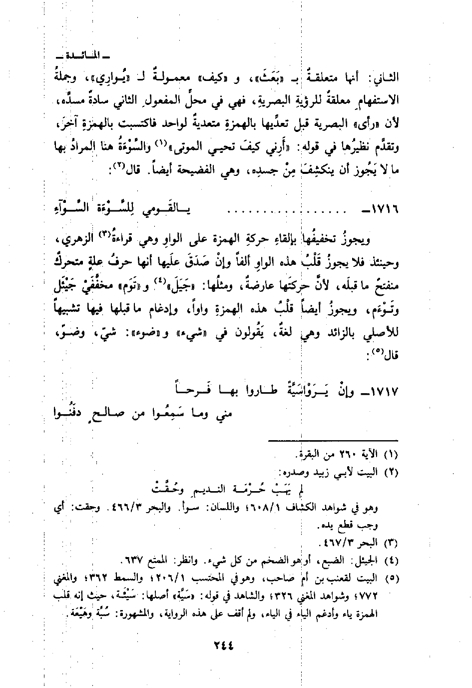 ويجوزُ تخفيفُها بإلقاءِ حركةِ الهمزة على الواوِ وهي قراءةُ الزهري، وحينئذ فلا يجوزُ قَلْبُ هذه الواوِ ألفاً وإنْ صَدَقَ علَيها أنها حرفُ علةٍ متحركٌ منتفحُ ما قبلَه، لأنَّ حركتَها عارضةٌ، ومثلُها: «جَيَلَ» «وتَوَم» مخفَّفَيْ جَيْئَل وتَوْءَم، يجوزُ أيضاً قلْبُ هذه الهمزةِ واواً، وإدغام ما قبلها فيها تشبيهاً للأصلي بالزائد وهي لغةٌ، يَقُولون في «شيء» و «ضوء» : شيّ، وضوّ، قال: