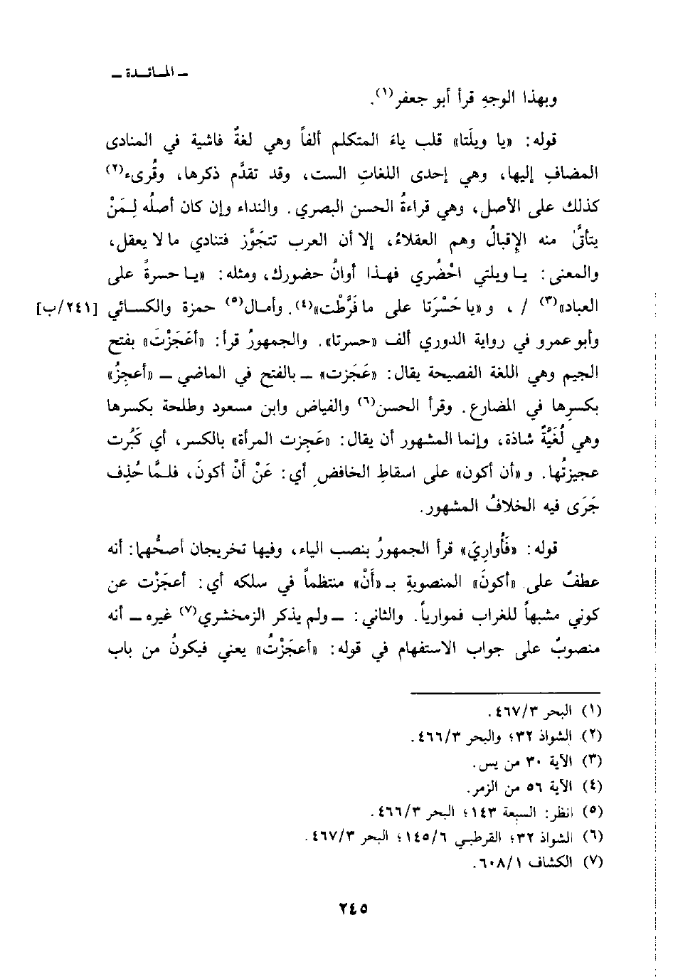 قوله: {يَاوَيْلَتَا} قلب ياءَ المتكلم ألفاً وهي لغةٌ فاشية في المنادى المضافِ إليها، وهي إحدى اللغاتِ الست، وقد تقدَّم ذكرها، وقُرئ كذلك على الأصل، وهي قراءةُ الحسن البصري. والنداء وإن كان أصلُه لِمَنْ يتأتَّى منه الإِقبالُ وهم العقلاءُ، إلا أن العرب تتجَوَّز فتنادي ما لا يعقل، والمعنى: يا ويلتي احْضُري فهذا أوانُ حضورك، ومثله: {ياحسرة عَلَى العباد} [يس: 30] /، و {ياحسرتا على مَا فَرَّطَتُ} [الزمر: 56] . وأمال حمزة والكسائي وأبو عمرو في رواية الدوري ألف «حسرتا» والجمهورُ قرأ «أعَجْزْتَ» بفتح الجميم وهي اللغة الفصحية يقال: «عَجَزت» - بالفتح في الماضي - «أعجِزُ» بكسرِها في المضارع. وقرأ الحسن والفياض وابن مسعود وطلحة بكسرها وهي لُغَيَّةٌ شاذة، وإنما المشهور أن يقال: «عَجِزت المرأة» بالكسر، أي كَبُرت عجيزتُها. و «أن أكون» على اسقاطِ الخافضِ أي عَنْ أكونَ، فلمَّا حُذِف جَرَى فيه الخلافُ المشهور.