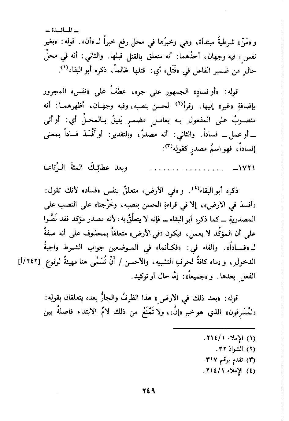 ذكره أبو البقاء و «في الأرض» متعلقٌ بنفس «فساد» لأنك تقول: «افسد في الأرض» إلا في قراءةِ الحسن بنصبه، وخَرَّجناه على النصب على المصدريةِ - كما ذكره أبو البقاء - فإنه لا يتعلَّقُ به، لأنه مصدر مؤكد فقد نَصُّوا على أن المؤكِّدة لا يعمل، فيكون «في الأرض» متعلقاً بمحذوف على أنه صفةٌ ل «فساداً» والفاء في: «فكأنما» في الموضعين جواب الشرط واجبةُ الدخولِ، و «ما» كافةٌ لحرفِ التشبيه، والأحسن / أَنْ تُسَمَّى هنا مهيئةً لوقوعِ الفعلِ بعدها.