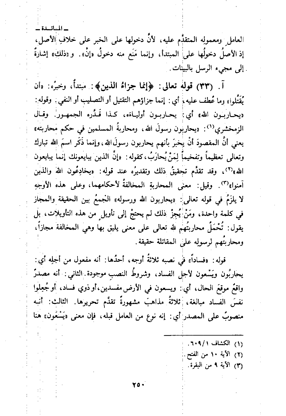 قوله تعالى: {إِنَّمَا جَزَآءُ الذين} : مبتدأٌ، وخبرُه: «أن يُقَتَّلوا» وما عُطف عليه، أي: إنما جزاؤهم التقتيل أو التصليب أو النفي. وقوله: {يُحَارِبُونَ الله} أي: يحاربون أولياءَه، كذا قَدَّره الجمهور. وقال الزمخشري: «يحاربون رسولَ الله، ومحاربةُ المسلمين في حكم محاربته» يعني أنَّ المقصودَ أنْ يخبرَ بأنهم يحاربون رسولَ الله، وإنما ذَكَر اسمَ الله تبارك وتعالى تعظيماً وتفخيماً لِمَنْ يُحارَبُ، كقوله: {إِنَّ الذين يُبَايِعُونَكَ إِنَّمَا يُبَايِعُونَ الله} وقد تقدَّم تحقيقُ ذلك وتقديرُه عند قوله: {يُخَادِعُونَ الله والذين آمَنُوا} [البقرة: 9] . وقيل: معنى المحاربةِ المخالفةُ لأحكامهما، وعلى هذه الأوجهِ لا يلزَمُ في قوله تعالى: {يُحَارِبُونَ الله وَرَسُولَهُ} الجمعُ بين الحقيقة والمجاز في كلمة واحدة، ومَنْ يُجِزْ ذلك لم يحتجْ إلى تأويلٍ من هذه التأويلات، بل يقول: تُحْمَلُ محاربتُهم لله تعالى على معنى يليق بها وهي المخالفة مجازاً، ومحاربتُهم لرسولِ على المقاتلة حقيقة.