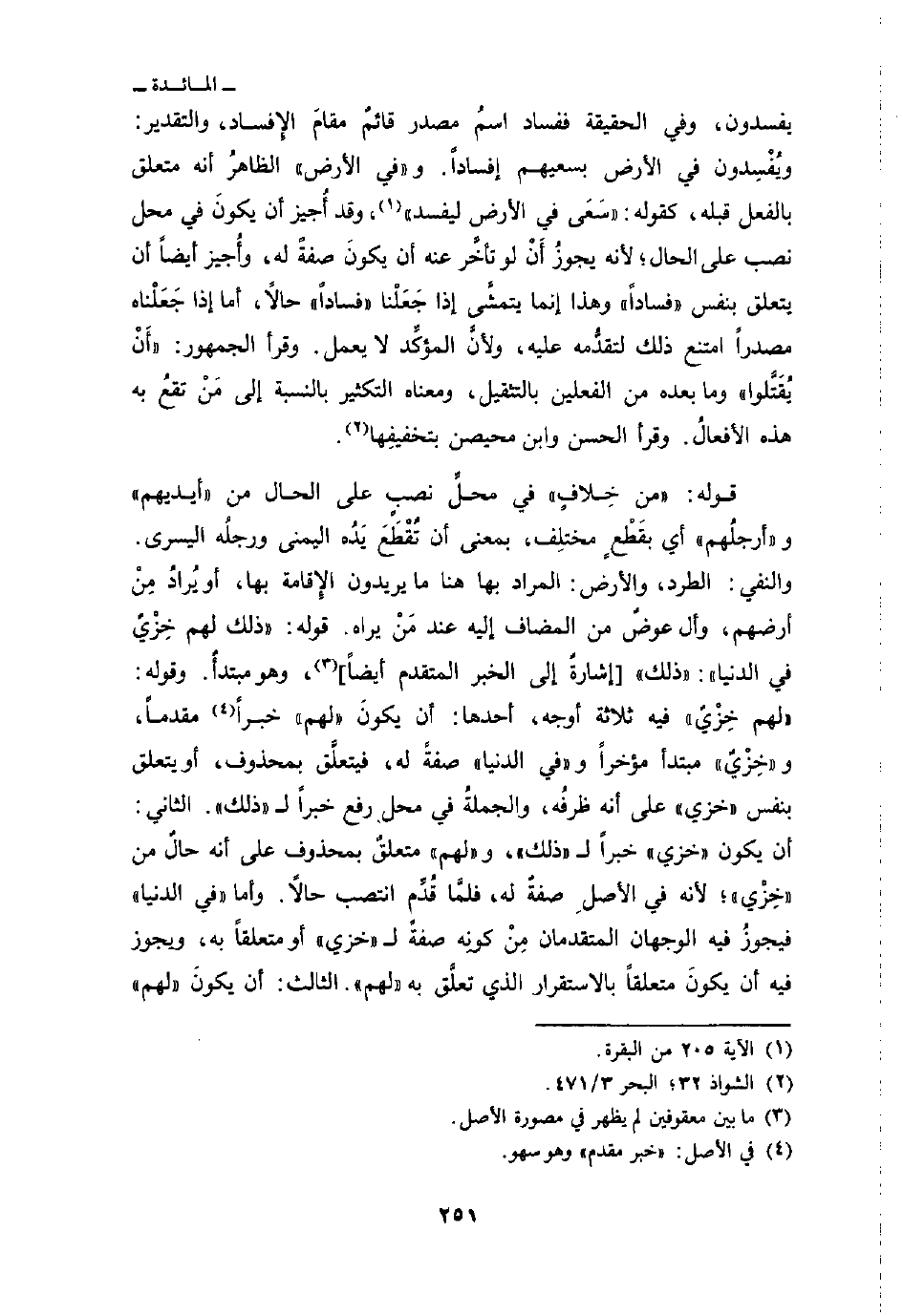 يفسدون، وفي الحقيقة ففساد اسمُ مصدر قائمٌ مقامَ الإِفساد، والتقدير: ويُفْسِدون في الأرض بسعيهم إفساداً. «وفي الأرض» الظاهرُ أنه متعلق بالفعل قبله، كقوله: {سعى فِي الأرض لِيُفْسِدَ} [البقرة: 205] ، وقد أُجيز أن يكونَ في محل نصب على الحال؛ لأنه يجوزُ أَنْ لو تأخَّرت عنه ان يكونَ صفةً له، وأُجيز أيضاً أن يتعلق بنفس «فساداً» وهذا إنما يتمشَّى إذا جَعَلْنا «فساداً» حالاً، أما إذا جَعَلْناه مصدراً امتنع ذلك لتقدُّمه عليه، ولأنَّ المؤكِّد لا يعمل. وقرأ الجمهور: «أَنْ يُقَتَّلوا» وما بعده من الفعلين بالتثقيل، ومعناه التكثير بالنسبة إلى مَنْ تقعُ به هذه الأفعالُ. وقرأ الحسن وابن محيصن بتخفيفِها.