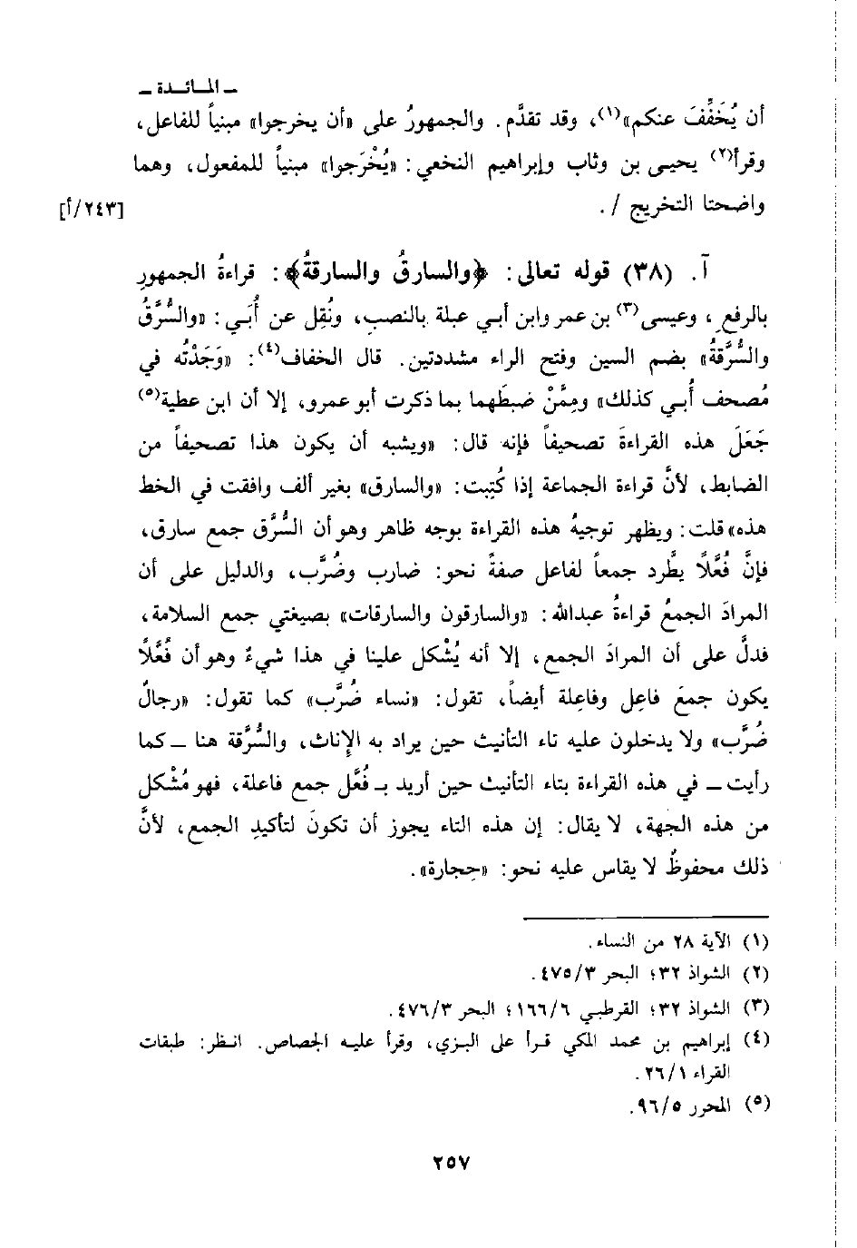 قوله تعالى: {والسارق والسارقة} : قراءةُ الجمهور بالرفعِ، وعيسى بن عمر وابن أبي عبلة بالنصبِ، ونُقِل عن أُبَي: «والسُّرَّقُ والسُّرَّقةُ» بضم السين وفتح الراء مشددتين. قال الخفاف: «وجَدْتُه في مُصحف أُبي كذلك» ومِمَّنْ ضبطَهما بما ذكرت أبو عمرو، إلا أن ابن عطية جَعَل هذه القراءة تصحيفاً فإنه قال: «ويشبه أن يكون هذا تصحيفاً من الضابط، لأنَّ قراءة الجماعة إذا كُتِبت:» والسارق «بغير ألف وافقت في الخط هذه» قلت: ويظهر توجيهُ هذا القراءة بوجه ظاهر وهو أن السُّرَّق جمع سارق، فإنَّ فُعَّلاً يطَّرد جمعاً لفاعل صفةً نحو: ضارب وضُرَّب، والدليل على أن المرادَ الجمعُ قراءةُ عبد الله: «والسارقون والسارقات» بصيغتي جمع السلامة، فدلَّ على أن المرادَ الجمع، إلا أنه يُشْكل علينا في هذا شيءٌ وهو أن فُعَّلاً يكون جمعَ فاعِل وفاعِله أيضاً، تقول: «نساء ضُرَّب» كما تقول: «رجالٌ ضُرَّب» ولا يدخلون عليه تاء التأنيث حين يراد به الإِناث، والسُّرَّقة هنا - كما رأيت - في هذه القراءة بتاء التأنيث حين أريد ب «فُعَّل» جمع فاعله، فهو مُشْكل من هذه الجهة، لا يقال: إن هذا التاء يجوز أن تكونَ لتأكيدِ الجمع، لأنَّ ذلك محفوظٌ لا يقاس عليه نحو: «حِجارة» .