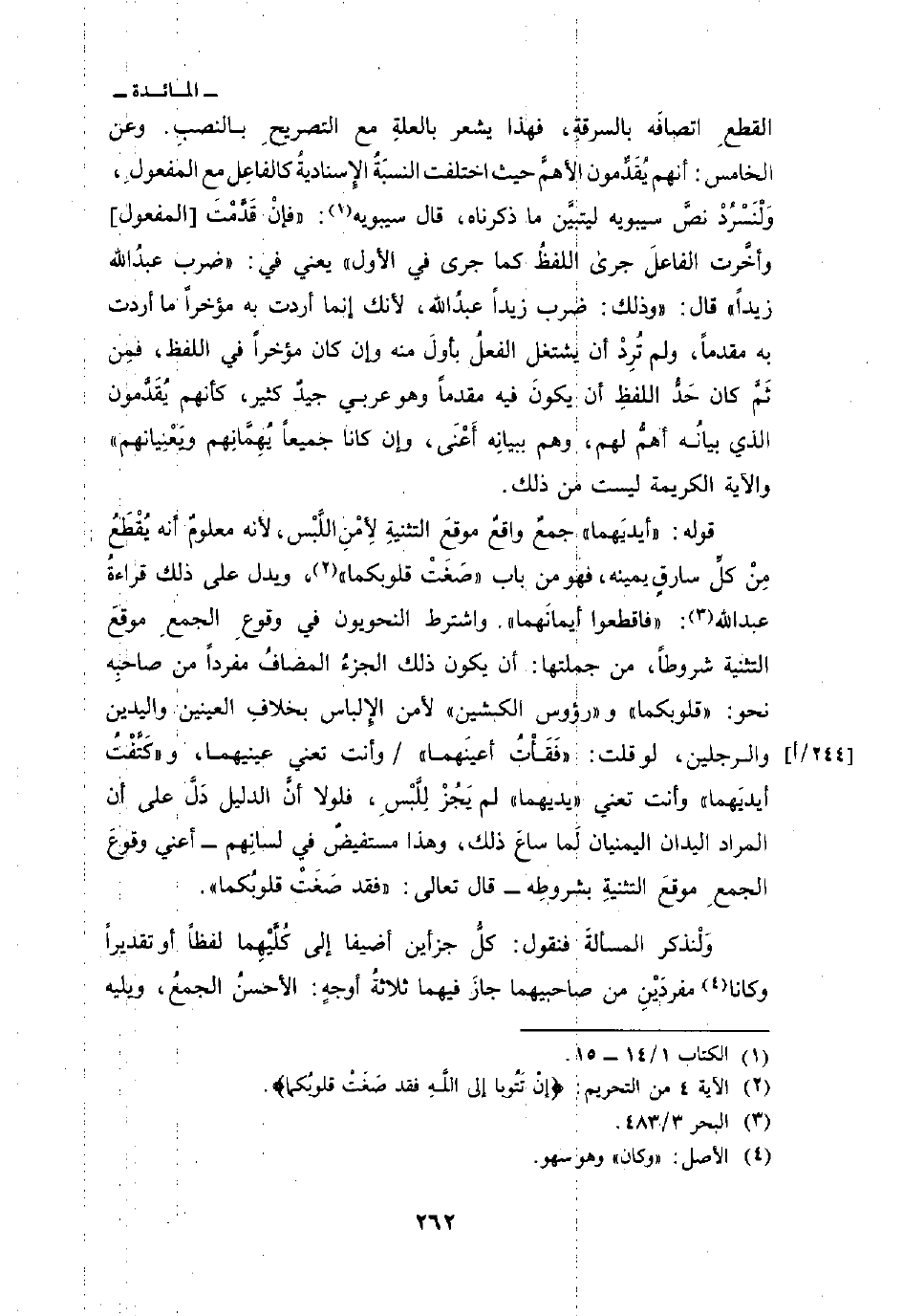 القطعِ اتصافَه بالسرقةِ، فهذا يشعر بالعلةِ مع التصريحِ بالنصبِ، وعن الخامس: انهم يُقَدِّمون الأهمَّ حيث اختلفت النسبَةُ الإِسناديةُ كالفاعِل مع المفعولِ، وَلْنَسْرُدْ نصَّ سيبويه ليتبيِّن ما ذكرناه، قال سيبويه:» فإنْ قَدَّمْتَ [المفعول] وأخَّرت الفاعلَ جرى اللفظُ كما جرى في الأول «يعني في:» ضرب عبدُ الله زيداً «قال:» وذلك: ضرب زيداً عبدُ الله، لأنك إنما أردت به مؤخراً ما أردت به مقدماً، ولم تُرِد أن يشتغل الفعلُ بأولَ منه وإن كان مؤخراً في اللفظ، فمِن ثَمَّ كان حَدُّ اللفظِ أن يكونَ فيه مقدماً وهو عربي جيدٌ كثير، كأنهم يُقَدَّمون الذي بيانُه اهمُّ لهم، وهم ببيانِه أَعْنَى، وإن كانا جميعاً يُهِمَّانِهم ويَعْنِيانهم «والآية الكريمة ليست من ذلك.