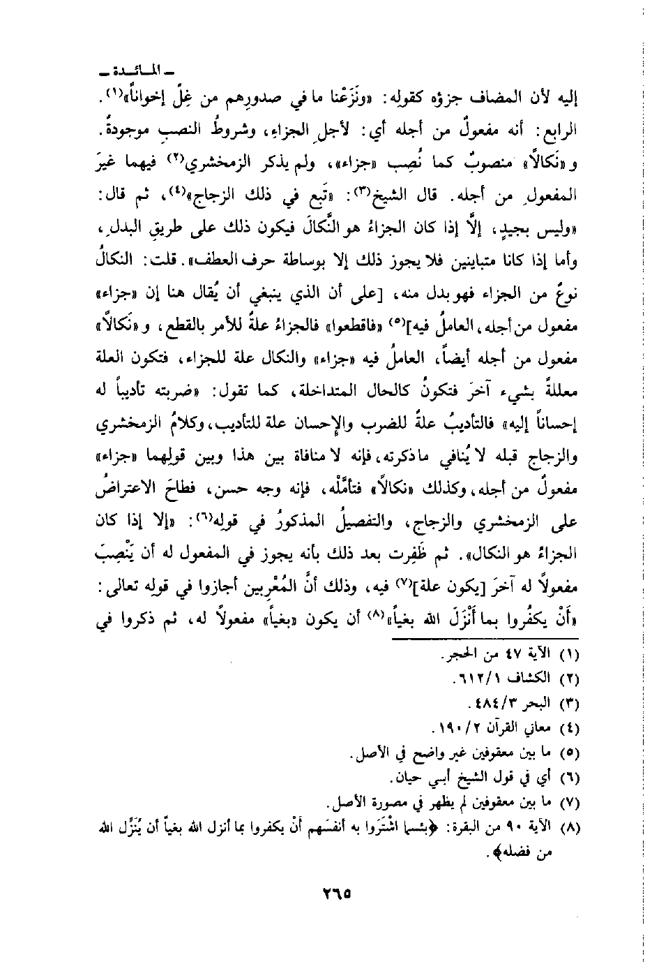 إليه لأن المضاف جزؤه كقوله: {وَنَزَعْنَا مَا فِي صُدُورِهِم مِّنْ غِلٍّ إِخْوَاناً} [الحجر: 47] . الرابع: أنه مفعولٌ من أجله أي: لأجلِ الجزاءِ، وشروطُ النصبِ موجودةٌ. و «نَكالاً» منصوبٌ كما نُصِب «جزاء» ولم يذكر الزمخشري فيهما غيرَ المفعولِ من أجله. قال الشيخ: «تَبع في ذلك الزجاج» ثم قال: «وليس بجيدٍ، إلاَّ إذا كان الجزاءُ هو النَّكالَ فيكون ذلك طريق البدلِ، وأما إذا كان متباينين فلا يجوز ذلك إلى بوساطة حرف العطف» قلت: النكالُ نوعٌ من الجزاء فهو بدل منه، [على أن الذي ينبغي أن يُقال هنا إن «جزاء» مفعول من أجله، العاملُ فيه] «فاقطعوا» فالجزاءُ علةٌ للأمر بالقطع، و «نَكالاً» مفعول من أجله أيضاً، العاملُ فيه «جزاء» والنكال علة للجزاء، فتكون العلة معللةً بشيء آخرَ فتكونُ كالحال المتداخلة، كما تقول: «ضربته تأديباً له إحساناً إليه» فالتأديبُ علةٌ للضرب والإِحسان علة للتأديب، وكلامُ الزمخشري والزجاج قبله لا يُنافي ما ذكرته، فإِنه لا منافاة بين هذا وبين قولهما «جزاء» مفعولٌ من أجله، وكذلك «نكالاً» فتأمَّلْه، فإنه وجه حسن، فطاحَ الاعتراضُ على الزمخشري والزجاج، والتفصيلُ المذكورُ في قوله: «إلا إذا كان الجزاءُ هو النكال» ثم ظَفِرت بعد ذلك بأنه يجوز في المفعول له أن يَنْصِبَ مفعولاً له آخرَ [يكون علة] فيه، وذلك أنَّ المُعْرِبين أجازوا في قوله تعالى