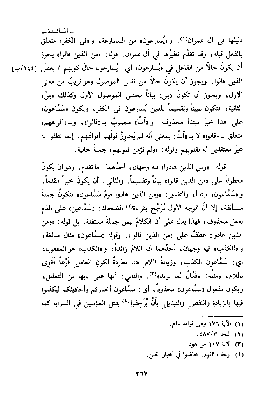 دليلها في آل عمران و «يُسارعون» من المسارعة، و «في الكفر» متعلق بالفعل قبله، وقد تقدَّم نظيرُها في آل عمران. قوله: {مِنَ الذين قالوا} يجوز أَنْ يكونَ حالاً من الفاعل في «يُسارعون» أي: يُسارعون حالَ كونِهم / بعضَ الذين قالوا، ويجوز أن يكونَ حالاً من نفس الموصول وهو قريبٌ من معنى الأول، ويجوز أن تكونَ «مِنْ» بياناً لجنس الموصول الأول وكذلك «مِنْ» الثانية، فتكون تبييناً وتقسيماً للذين يُسارعون في الكفر، ويكون «سَمَّاعون» على هذا خبرَ مبتدأ محذوف. و «آمنَّا» منصوبٌ ب «قالوا» وب «أفواههم» متعلق ب «قالوا» لا ب «آمنًّا» بمعنى أنه لم يُجَاوِزْ قولُهم أفواهَهم، إنما نطقوا به غيرَ معتقدين له بقلوِبهم وقوله: {وَلَمْ تُؤْمِن قُلُوبُهُمْ} جملةٌ حالية.
