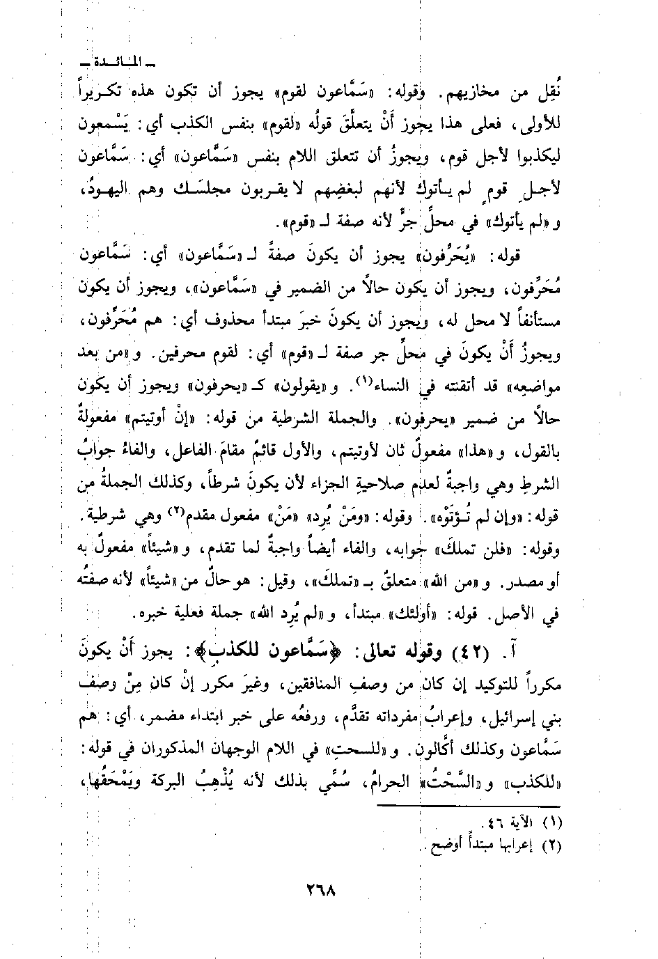 وقوله تعالى: {سَمَّاعُونَ لِلْكَذِبِ} : يجوز أَنْ يكونَ مكرراً للتوكيد إن كان من وصفِ المنافقين، وغيرَ مكرر إنْ كان مِنْ وصف بني إسرائيل، وإعرابُ مفرداته تقدَّم، ورفعُه على خبر ابتداء مضمر، أي: هم سَمَّاعون وكذلك أكَّالون. و «للسحتِ» في اللام الوجهان المذكوران في قوله: «للكذب» و «السَّحْتُ» الحرامُ، سُمِّي بذلك لأنه يُذْهِبُ البركة ويُمْحَقُها،