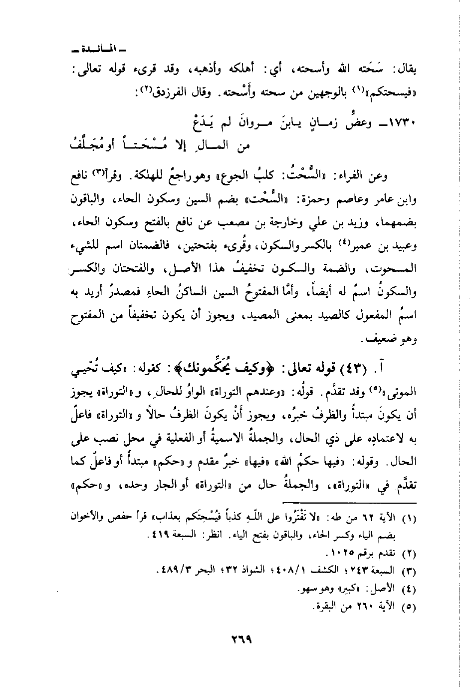 وعن الفراء: «السُّحْتُ: كلبُ الجوع» وهو راجعٌ للهلكة. وقرأ نافع وابن عامر وعاصم وحمزة: «السُّحْت» بضم السين وسكون الحاء، والباقون بضمهما، وزيد بن علي وخارجة بن مصعب عن نافع بالفتح وسكون الحاء، وعبيد بن عمير بالكسر والسكون وقُرئ بفتحتين، فالضمتان اسم للشيء المسحوت، والضمة والسكون تخفيفُ هذا الأصل، والفتحتان والكسر والسكونُ اسمٌ له أيضاً، وأمَّا المفتوحُ السين الساكنُ الحاءِ فمصدرٌ أريد به اسمُ المفعول كالصيد بمعنى المصيد، ويجوز أن يكون تخفيفاً من المفتوح وهو ضعيف.