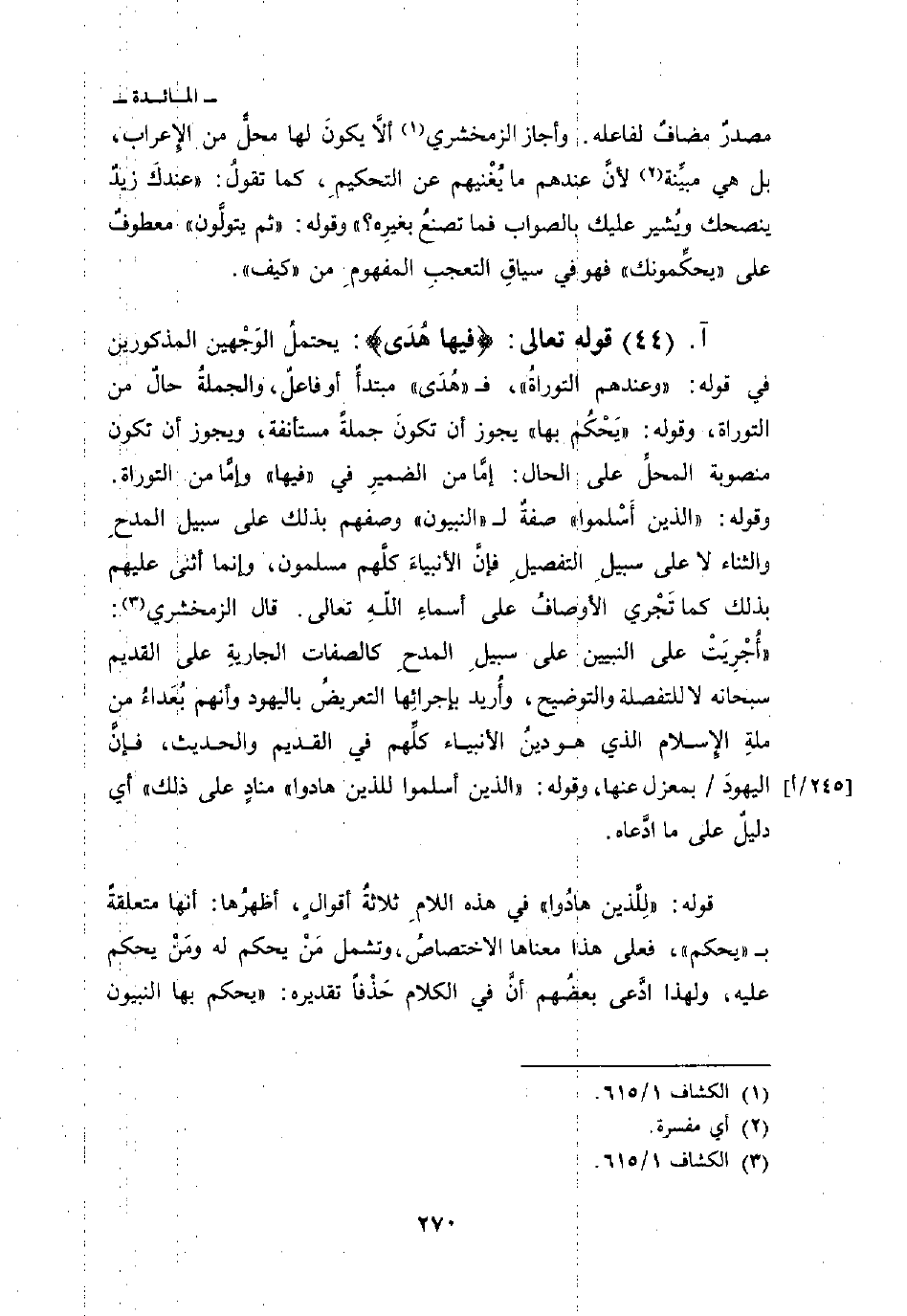 قوله تعالى: {فِيهَا هُدًى} : يحتملُ الوَجْهين المذكورين في قوله: {وَعِنْدَهُمُ التوراة} ف «هُدَى» مبتدأٌ أو فاعلٌ، والجملةُ حالٌ من التوراة. وقوله: {يَحْكُمُ بِهَا} يجوز أن تكونَ جملةً متسأنفة، ويجوز أن تكون منصوبةً المحلِّ على الحال: إمَّا من الضميرِ في «فيها» وإمَّا من التوارة. وقوله: {الذين أَسْلَمُواْ} صفةٌ ل «النبيون» وصفهم بذلك على سبيل المدحِ والثناء لا على سبيلِ التفصيلِ فإنَّ الأنبياءَ كلَّهم مسلمون، وإنما أثنى عليهم بذلك كما تَجْري الأوصافُ على أسماءِ اللَّهِ تعالى. قال الزمخشري: «أُجْرِيَتْ على النبيين على سبيلِ المدحِ كالصفات الجاريةِ على القديم سبحانه لا للتفصلة والتوضيح، وأُريد بإجرائِها التعريضُ باليهود وأنهم بُعَداءُ من ملةِ الإِسلام الذي هو دينُ الأنبياء كلِّهم في القديم والحديث، فإنَّ اليهودَ/ بمعزل عنها، وقوله: {الذين أَسْلَمُواْ لِلَّذِينَ هَادُواْ} منادٍ على ذلك» أي دليلٌ على ما ادِّعاه.
