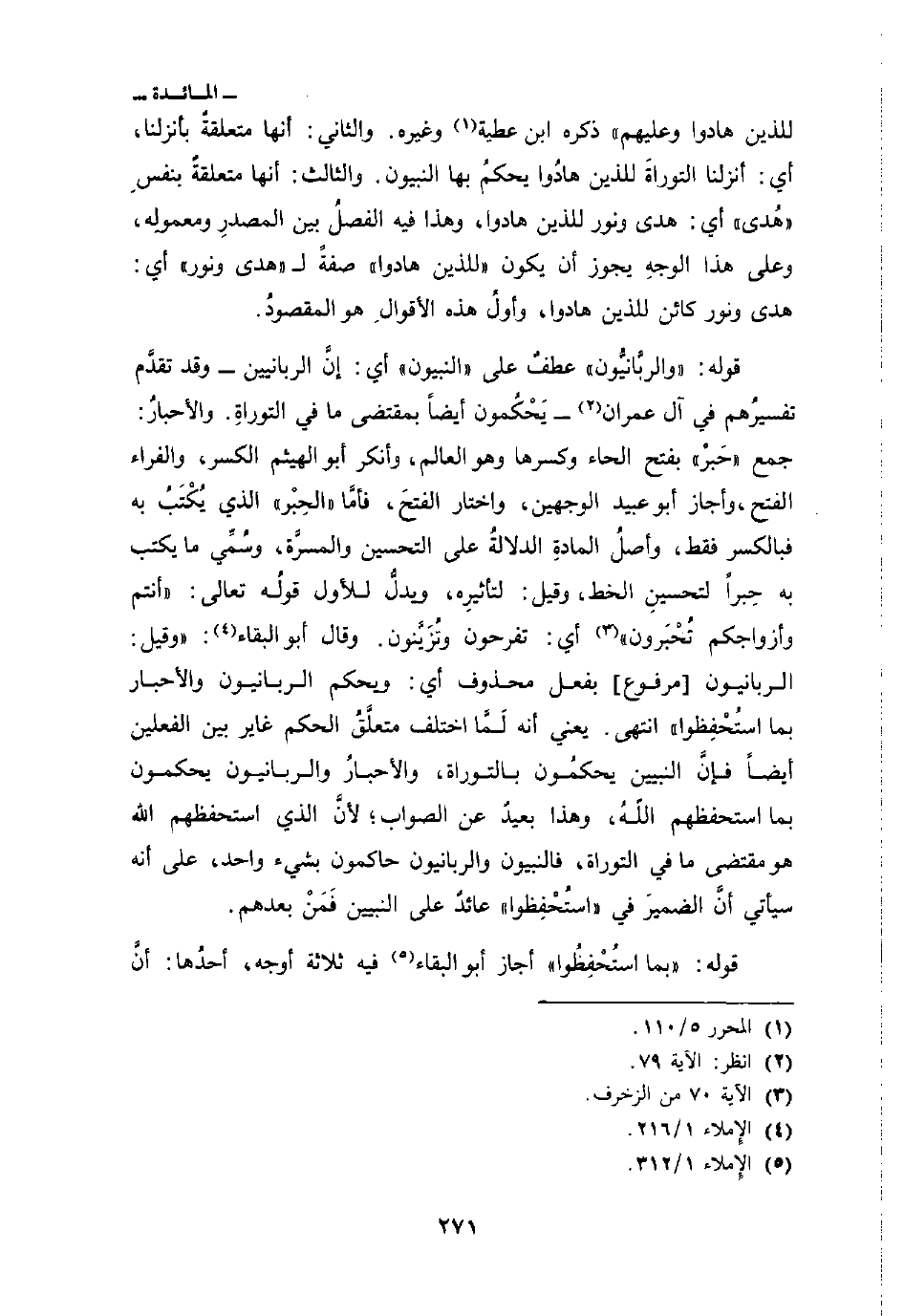 قوله: {والربانيون} عطفٌ على «النبيون» أي: إنَّ الربانيين - وقد تقدَّم تفسيرُهم في آل عمران - يَحْكُمون أيضاً بمقتضى ما في التوراةِ. والأحبارُ: جمع «حَبرْ» بفتح الحاء وكسرها وهو العالم، وأنكر أبو الهيثم الكسر، والفراء والفتح، وأجاز أبو عبيد الوجهين، واختار الفتحَ، فأمَّا «الحِبْر» الذي يُكْتَبُ به فالبكسر فقط، وأصلُ المادةِ الدلالةُ على التحسين والمسرَّة، وسُمِّي ما يكتب به حِبراً لتحسينِ الخط، وقيل: لتأثيره، ويدلُّ للأول قولُه تعالى: {أَنتُمْ وَأَزْوَاجُكُمْ تُحْبَرُونَ} [الزخرف: 70] أي: تفرحون وتُزَيَّنون وقال أبو البقاء: «وقيل الربانيون [مرفوع] بفعل محذوف أي: ويحكم الربانيون والأحبار بما استُحْفِظوا» انتهى. يعني أنه لَمَّا اختلف متعلَّقٌ الحكم غاير بين الفعلين أيضاً فإنَّ النبيين يحكمُون بالتوارة، والأحبارُ والربانيون يحكمون بما ساتحفظهم اللهُ، وهذا بعيدٌ عن الصواب؛ لأنَّ الذي استحفظهم الله هو مقتضى ما في التوراة، فالنبيون والربانيون حاكمون بشي واحد، على أنه سيأتي أنَّ الضميرَ في «استُحْفِظوا» عائدٌ على النبيين فَمَنْ بعدهم.