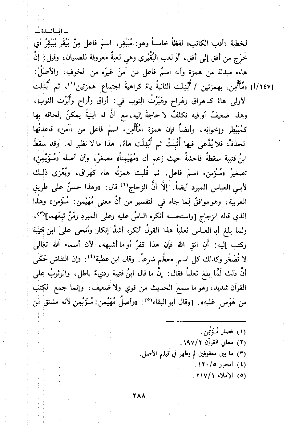 لخطبة» أدب الكاتب «لفظاً خامساً وهو:» مُبَيْقِر، اسمَ فاعل مِنْ بَيْقَر يُبَيْقِرُ أي خَرَج من أفق إلى أفق، أو البُقَّيْرى وهي لعبةٌ معروفة للصبيان، وقيل: إنَّ هاء مبدلة من همزة وأنه اسمُ فاعل من آمنَ غيرَه من الخوفِ، والأصلُ: «مُأَأْمِن» بهمزتين / أُبْدِلت الثانيةُ ياءً كراهيةَ اجتماعِ همزتين ثم أُبْدلت الأولى هاءً ك هراق وهَراح وهَبَرْتُ الثوب في: أراق وأراح وأَبَرْت الثوب، وهذا ضعيفٌ أو فيه تكلفٌ لا حاجةَ إليه، مع أنَّ له أبنيةً يمكنُ إلحاقه بها كمُبَيْطِر وإخوانِه، وأيضاً فإن همزة «مُأَأْمِن» اسمَ فاعل من «آمن» قاعدتُها الحذفُ فلا يُدَّعى فيها أُثْبِتَتْ ثم أُبْدِلَت هاءً، هذا ما لا نظير له. وقد سقطَ ابنُ قتيبة سقطةً فاحشة حيث زعم أن «مُهَيْمِناً» مصغرٌ، وأن أصله «مُؤَيْمِن» تصغيرُ «مُؤْمن» اسمَ فاعل، ثم قُلبت همزتُه هاء كهَراق، ويُعْزى ذلك لأبي العباس المبرد أيضاً.