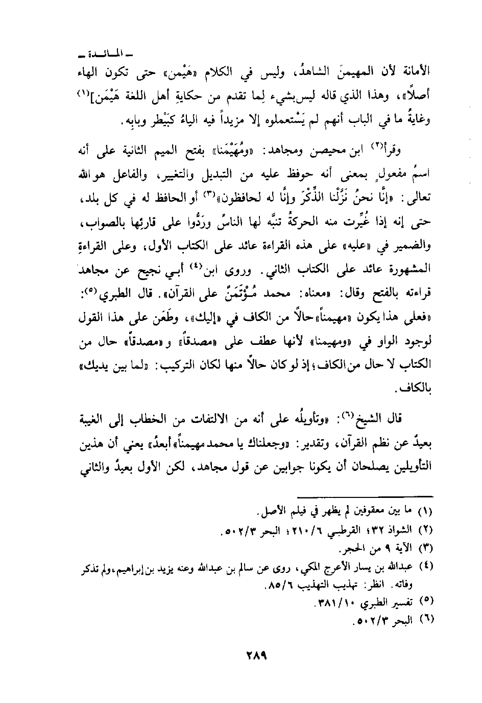 وقرأ ابن محيصن ومجاهد: «ومُهَيْمَنا» بفتح الميم الثانية على أنه اسمُ معفولٍ بمعنى أنه حوفظ عليه من التبديل والتغيير، والفاعل هو الله تعالى: {إِنَّا نَحْنُ نَزَّلْنَا الذكر وَإِنَّا لَهُ لَحَافِظُونَ} [الحجر: 9] أو لحافظ له في كل بلد، حتى إنه إذا غُيِرت منه الحركةُ تنبَّه لها الناسُ ورَدُّوا على قارئِها بالصواب، والضمير في «عليه» على هذه القراءة عائد على الكتاب الأول، وعلى القراءةِ المشهورة عائد على الكتاب الثاني. وروي ابن أبي نجيح عن مجاهد قراءته بالفتح وقال: «معناه: محمد مُؤْتَمَنٌ على القرآن» قال الطبري: «فعلى هذا يكون» مهيمناً «حالاً من الكاف في» إليك «وطَعَن على هذا القول لوجود الواو في» ومهيمنا «لأنها عطف على» مصدقاً «و» مصدقاً «حال من الكتاب لا حال من الكاف؛ إذ لو كان حالاً منها لكان التركيب:» لما بين يديك «بالكاف.