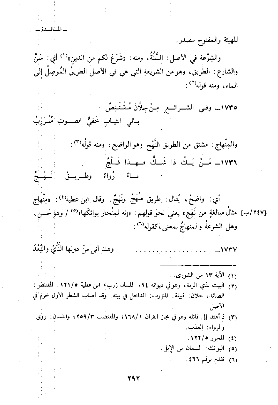 والشِرْعة في الأصل: السُّنَّةُ، ومنه: {شَرَعَ لَكُم مِّنَ الدين} [الشورى: 13] أي: سَنَّ والشارع: الطريق، وهو من الشريعةِ التي هي في الأصل الطريقُ المُوصِلُ إلى الماء، ومنه قوله: