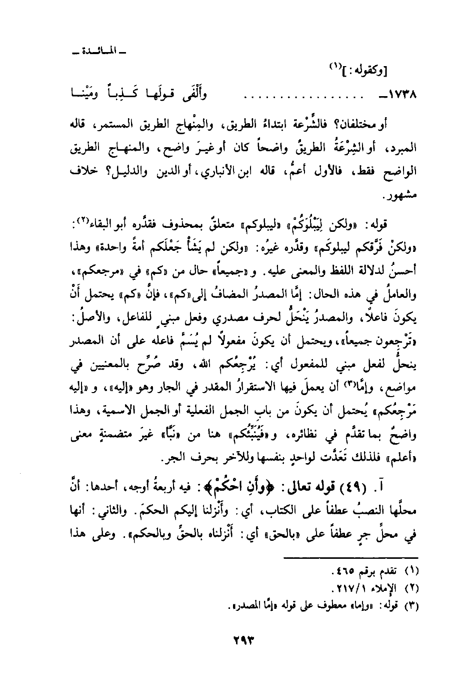 قوله: {ولكن لِّيَبْلُوَكُمْ} متعلقٌ بمحذوف فقدَّره أبو البقاء «ولكنْ فَرَّقكم ليبلوكَم» وقدَّره غيرُه: «ولكن لم يَشَأْ جَعْلَكم أمةً واحدة» وهذا أحسنُ لدلالة اللفظ والمعنى عليه. و «جميعاً» حال من «كم» في «مرجعكم» ، والعاملُ في هذه الحال: إمَّا المصدرُ المضافُ إلى «كم» فإنَّ «كم» يحتمل أَنْ يكونَ فاعلاً، والمصدرُ يَنْحَلُّ لحرف مصدري وفعل مبنيٍ للفاعل، والأصلُ: «تَرْجعون جميعاً» ويحتمل أن يكونَ معفولاً لم يُسَمَّ فاعله على أن المصدر ينحلُّ لفعل مبني للمفعول أي: يُرْجِعُكم الله، وقد صُرِّح بالمعنيين في مواضع، وإمَّا أن يعملَ فيها الاستقرارُ المقدرفي الجار وهو «إليه» ، و «إليه مَرْجِعُكم» يُحتمل أن يكونَ من بابِ الجمل الفعلية أو الجمل الاسمية، وهذا واضحٌ بما تقدَّم في نظائره، و «فَيُنَبِّئُكم» هنا من «نَبَّا» غيرَ متضمنةٍ معنى «أعلم» فلذلك تَعَدَّت لواحدٍ بنفسها وللآخر بحرف الجر.