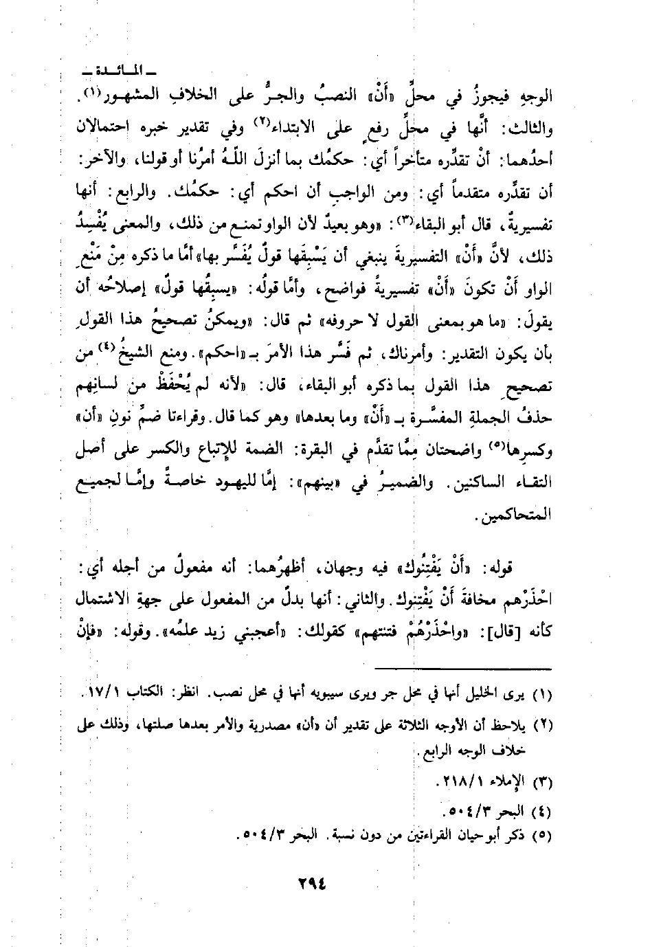 الوجهِ فيجوزُ في محلِّ» أَنْ «النصبُ والجرُّ على الخلافِ المشهور. والثالث: أنَّها في محلِّ رفعٍ على الابتداء وفي تقديره خبره احتملان أحدُهما: أنْ تقدِّر متأخراً أي: حكمُك بما أنزلَ اللهُ أمرُنا أو قولنا، والآخر: أن تقدِّره متقدماً أي: ومن الواجبِ أن احكم أي: حكمُك. والرابع: أنها تفسيريةٌ، قال أبو البقاء:» وهو بعيدٌ لأن الواو تمنع من ذلك، والمعنى يُفْسِدُ ذلك، لأنَّ «أَنْ» التفسيريةَ ينبغي أن يَسْبِقها قولٌ يُفَسَّر بها «أمَّا ما ذكره مِنْ مَنْعِ الواو أَنْ تكون» أَنْ «تفسيريةً فواضح، وأمَّا قولُه:» يسبِقُها قولٌ «إصلاحُه أن يقولَ:» ما هو بمعنى القول لا حروفه «ثم قال:» ويمكنُ تصحيحُ هذا القولِ بأن يكون التقدير: وأمرناك، ثم فَسَّر هذا الأمرَ ب «احكم» ومنع الشيخُ من تصحيحِ هذا القول بما ذكره أبو البقاء، قال: «لأنه لم يُحْفَظْ من لسانِهم حذفُ الجملةِ المفسَّرة ب» أَنْ «وما بعدها» وهو كما قال. وقراءتا ضمِّ نونِ «أن» وكسرِها واضحتان مِمَّا تقدَّم في البقرة: الضمة للإِتباع والكسر على أصل التقاء الساكنين. والضميرُ في «بينهم» : إمَّا لليهود خاصةً وإمَّا لجميع المتحاكمين.