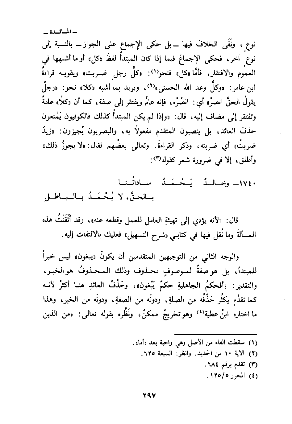 نوعٍ، ونَفَى الخلافَ فيها - بل حكى الإِجماع على الجواز - بالنسبة إلى نوع آخر، فحكى الإِجماعَ فيما إذا كان المبتدأُ لفظَ» كل «أو ما أشبهها في العموم والافتقار، فأمَّا» كل «فنحو:» كلُّ رجلٍ ضربت «وتقويه قراءةُ ابن عامر: {وكلُّ وعد الله الحسنى} ويريد بما أشبه» كلا «نحو:» رجلٌ يقولُ الحقَّ انصرْ «أي: انصُرْه، فإنه عامٌّ ويفتقر إلى صفة، كما أن» كلاً «عامةٌ وتفتقر إلى مضاف إليه، قال:» وإذا لم يكن المبتدأُ كذلك فالكوفيون يَمْنعون حذفَ العائد، بل ينصبون المتقدم مفعولاً به، والبصريون يُجيزون: «زيدٌ ضربتُ» أي ضربته، وذكره القراءةَ.