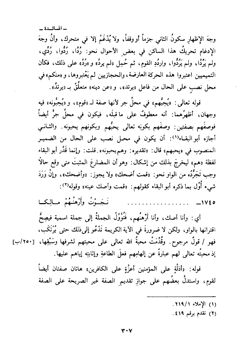 قوله تعالى: {يُحِبُّهُمْ} في محلِّ جر لأنها صفة ل «قوم» و «يُحِبُّونه» فيه وجهان، أظهرُهما: أنه معطوفٌ على ما قبلَه، فيكون في محلِّ جرٍّ أيضاً فوصفَهم بصفتين: وصفَهم بكونِه تعالى يحبُّهم وبكونهم يحبونه. والثاني أجازه أبو البقاء: أن يكون في محل نصب على الحال من الضمير المنصوب في «يحبهم» قال: «تقديره: وهم يحبونه» قلت: وإنما قَدَّر أبو البقاء لفظة «هم» ليخرجَ بذلك من إشكال: وهو أن المضارعَ المثبتَ متى وقع حالاً وجب تَجَرُّدُه من الواو نحو: «قمت أضحك» ولا يجوز: «وأضحك» وإنْ وَرَدَ شيء أُوِّل بما ذكره أبو البقاء كقولهم: «قمت وأصك عينه» وقوله: