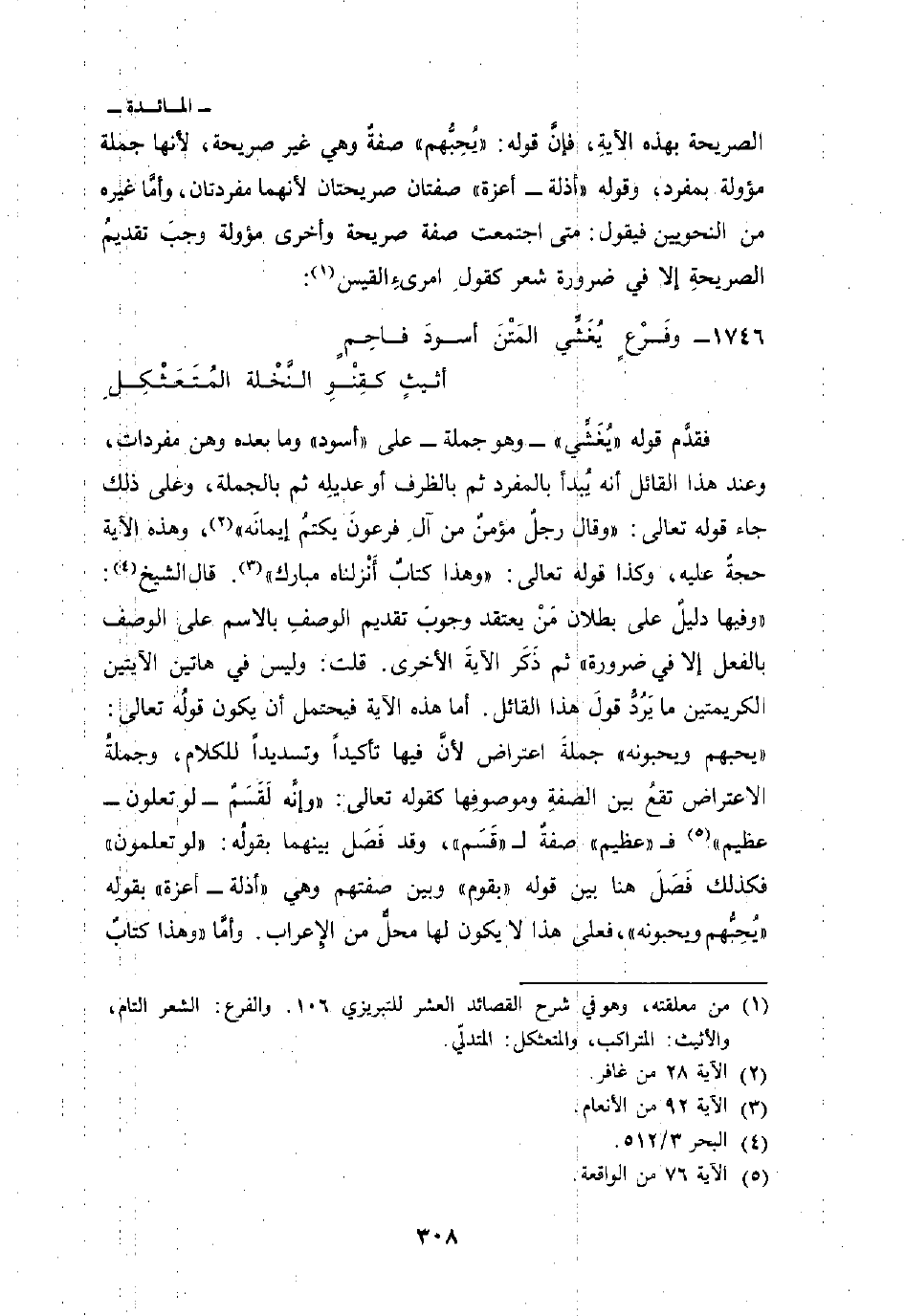 الصريحة بهذه الآيةِ، فإنَّ قوله: {يُحِبُّهم} صفةٌ وهي غير صريحة، لأنها جملة مؤولة بمفرد، وقوله «أذلة - أعزة» صفتان صريحتان لأنهما مفردتان، وأمَّا غيره من النحويين فيقول: متى اجتمعت صفة صريحة وأخرى مؤولة وجبَ تقديمُ الصريحةِ إلا في ضرورة شعر كقولِ امرئ القيس: