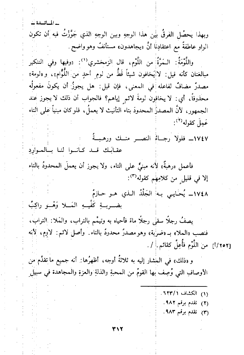 واللَّوْمَةُ: «المَرَّةُ من اللَّوْم، قال الزمخشري» وفيها وفي التنكير مبالغتان كأنه قيل: لا يَخافون شيئاً قَطُّ من لومِ أحدٍ من اللُّوُّام، و «لومة» مصدرٌ مضافٌ لفاعله في المعنى، فإن قيل: هل يجوزُ أن يكونَ مفعولُه محذوفاً، أي: لا يخافون لومةَ لائمٍ إياهم؟ فالجواب أن ذلك لا يجوز عند الجمهور، لأنَّ المصدرَ المحدودَ بتاء التأنيث لا يعملُ، فلو كان مبنياً على التاء عَمِلَ كقوله: