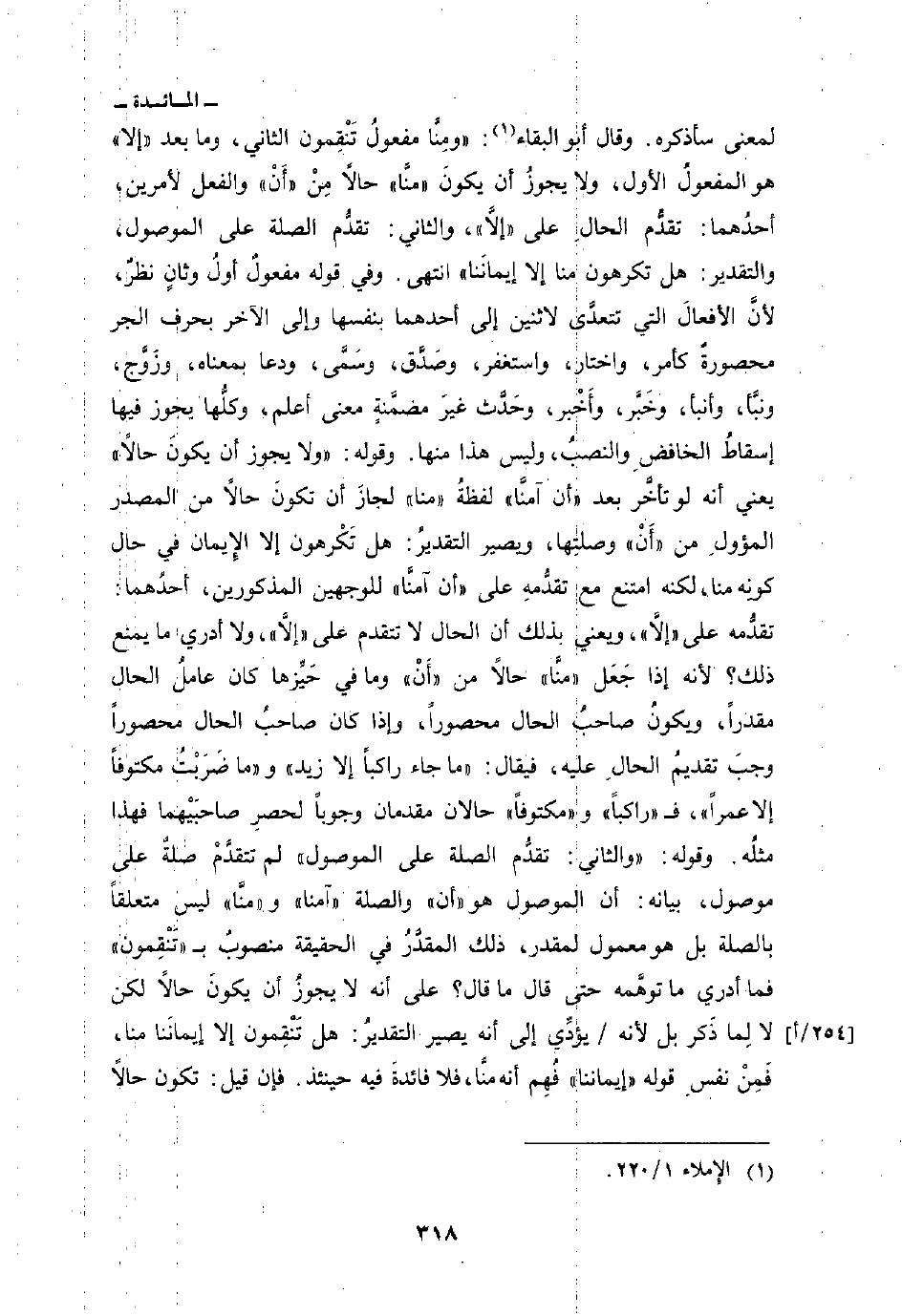 لمعنى سأذكره. وقال أبو البقاء: «ومِنَّا مفعولُ تَنْقِمون الثاني، وما بعد» إلا «هو المفعولُ الأول، ولا يجوزُ أن يكونَ» منَّا «حالاً مِنْ» أَنْ «والفعل لأمرين، أحدُهما: تقدُّم الحالِ على» إلاّ «، والثاني: تقدُّم الصلة على الموصول، والتقدير: هل تكرهون منا إلا إيمانَنا» انتهى. وفي قوله مفعولٌ أولُ وثانٍ نظرٌ، لأنَّ الأفعالَ التي تتعدَّى لاثنين إلى أحدهما بنفسها وإلى الآخر بحرف الجر محصورةٌ كأمر، واختار، واستغفر، وصَدَّق، وسَمَّى، ودعا بمعناه، وزَوَّج، ونبَّأ وأنبأ، وخَبَّر، وأَخْبر، وحَدَّث غيرَ مضمَّنةٍ معنى أعلم، وكلُّها يجوز فيها إسقاطُ الخافضِ والنصبُ، وليس هذا منها. وقوله: «ولا يجوز أن يكونَ حالاً» يعني أنه لو تأخَّر بعد «أن آمنَّا» لفظةُ «منا» لجازَ أن تكونَ حالاً من المصدر المؤولِ من «أَنْ» وصلتِها، ويصير التقديرُ: هل تَكْرهون إلا الإِيمان في حال كونِه منا، لكنه امتنع مع تقدُّمِه على «أن آمنَّا» للوجهين المذكورين، أحدُهما: تقدُّمه على «إلاَّ» ويعني بذلك أن الحال لا تتقدم على «إلاَّ» ولا أدري ما يمنع ذلك؟ لأنه إذا جَعَل «منَّا» حالاً من «أَنْ» وما في حَيِّزها كان عاملُ الحال مقدراً، ويكونُ صاحبُ الحال محصوراً، وإذا كان صاحبُ الحال محصوراً وجبَ تقديمُ الحالِ عليه، فيقال: «ما جاء راكباً زيد» و «ما ضَرَبْتُ مكتوفاً إلا عمراً» ف «راكباً» و «مكتوفاً» حالان مقدمان وجوباً لحصرِ صاحبَيْهما فهذا مثلُه. وقوله: «والثاني: تقدُّم الصلة على الموصول» لم تتقدَّمْ صلةٌ على موصول، بيانه: أن الموصول هو «أن» والصلة «آمنا» و «منَّا» ليس متعلقاً بالصلة بل هو معمول لمقدر، ذلك المقدَّرُ في الحقيقة منصوبٌ ب «تَنْقِمون» فما أدري ما توهَّمه حتى قال ما قال؟ على أنه لا يجوزُ أن يكونَ حالاً لكن لا لِما ذَكر بل لأنه / يؤدِّي إلى أنه يصير التقديرُ: هل تَنْقِمون إلا إيمانَنا منا، فَمِنْ نفسِ قوله «إيماننا» فُهِم أنه منَّا، فلا فائدةَ فيه حينئذ.