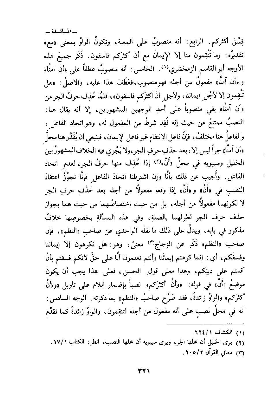 فِسْقَ أكثركم. الرابع: أنه منصوبٌ على المعية، وتكونُ الواوُ بمعنى» مع «تقديرُه: وما تَنْقِمون منا إلا الإِيمانَ مع أن أكثرَكم فاسقون. ذَكَر جميعَ هذه الأوجه أبو القاسم الزمخشري. والخامس: أنه منصوبٌ عطفاً على» أنْ آمنَّا «و» أن آمنَّا «مفعولٌ من أجله فهو منصوب، فعَطَفَ هذا عليه، والأصلُ:» هل تَنْقِمون إلا لأجْلِ إيماننا، ولأجل أنَّ أكثرَهم فاسقون «، فلمَّا حُذِف حرفُ الجر من» أن آمنَّا «بقي منصوباً على أحدِ الوجهين المشهورين، إلا أنه يقال هنا: النصبُ ممتنعٌ من حيث إنه فُقِد شرطٌ من المفعول له، وهو اتحاد الفاعلِ، والفاعلُ هنا مختلفٌ، فإنّ فاعل الانتقام غير فاعل الإِيمان، فينبغي أن يُقَدَّر هنا محلُّ» أن آمنَّا «جراً ليس إلا، بعد حذفِ حرفِ الجر، ولا يَجْري فيه الخلاف المشهورُ بين الخليل وسيبويه في محلِّ» أنْ «إذا حُذِف منها حرفُ الجر، لعدمِ اتحاد الفاعل. وأُجيب عن ذلك بأنَّا وإن اشترطنا اتحادَ الفاعلِ فإنَّا نجوِّزُ اعتقادَ النصبِ في» أَنْ «و» أَنَّ «إذا وقعا مفعولاً من أجله بعد حَذْفِ حرفِ الجر لا لكونِهما مفعولاً من أجله، بل من حيث اختصاصُهما من يحث هما بجواز حذف حرف الجر لطولِهما بالصلةِ، وفي هذه المسألةِ بخصوصِها خلافٌ مذكور في بابِه، ويدلُّ على ذلك ما نقلَه الواحدي عن صاحبِ» النظم «فإن صاحب» النظم «ذَكَر عن الزجاج معنًى، وهو: هل تكرهون إلا إيماننا وفسقَكم، أي: إنما كرهتم إيمانَنا وأنتم تعلمون أنَّا على حقٍّ لأنكم فسقتم بأنْ أقمتم على دينِكم، وهذا معنى قولِ الحسن، فعلى هذا يجب أن يكونَ موضعُ» أَنَّ «في قوله: {وَأَنَّ أَكْثَرَكُمْ} نصباً بإضمار اللام على تأويل» ولأنَّ أكثرَكم «والواوُ زائدةٌ، فقد صَرَّح صاحبُ» النظم «بما ذكرته.