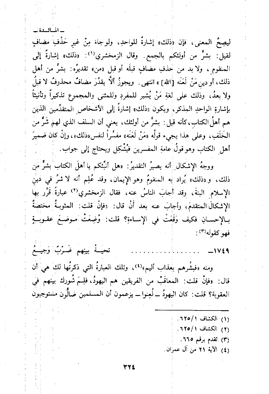 ومنه {فَبَشِّرْهُم بِعَذَابٍ أَلِيمٍ} [آل عمران: 21] ، وتلك العبارةُ التي ذكرتُها لك هي أن قال:» فإنْ قلت: المعاقَبُ من الفريقين هم اليهودُ، فلِمَ شُورك بينهم في العقوبة؟ قلت: كان اليهودُ - لُعِنوا - يزعمون أن المسلمين ضالُّون مستوجبون