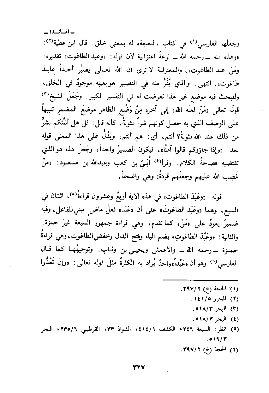 قوله: {وَعَبَدَ الطاغوت} في هذه الآية أربعٌ وعشرون قراءةً اثنتان في السبع، وهما» وعَبَد الطاغوتَ «على أن» عَبَد «فعلٌ ماضٍ مبني للفاعل، وفيه ضميرٌ يعودُ على» مَنْ «كما تقدم، وهي قراءة جمهور السبعة غيرَ حمزة. والثانية: و» عَبُدَ الطاغوتِ «بضم الباء وفتح الدال وخفض الطاغوت، وهي قراءةُ حمزة - رحمه الله - والأعمش ويحيى بن وثاب. وتوجيههُا كما قال الفارسي وهو أن» عَبُداً «واحدٌ يُراد به الكثرةُ مثلَ قوله تعالى: {وَإِن تَعُدُّواْ