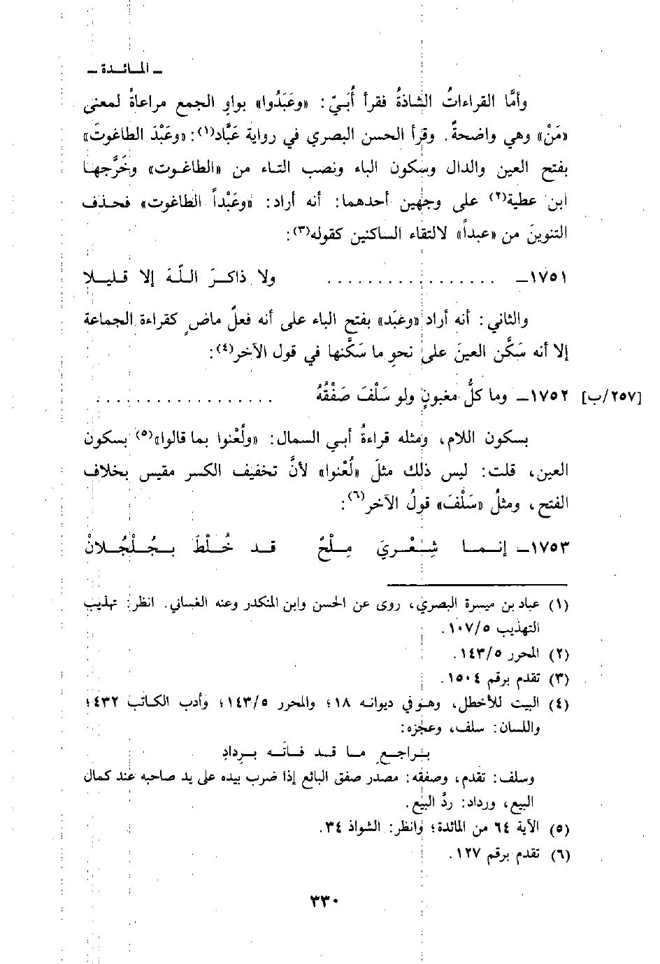 وأمَّا القراءاتُ الشاذةُ فقرأ أُبَيّ: و «عَبَدُوا» بواوِ الجمع مراعاةً لمعنى «مَنْ» وهي واضحةٌ. وقرأ الحسن البصري في رواية عَبَّاد و «عَبْدَ الطاغوت» بفتح العين والدال وسكون الباء ونصب التاء من «الطاغوت» وخَرَّجها ابن عطية على وجهين احدهما: أنه أراد: «وعَبْداً الطاغوت» فحذف التنوينَ من «عبداً» لالتقاء الساكنين كقوله:
