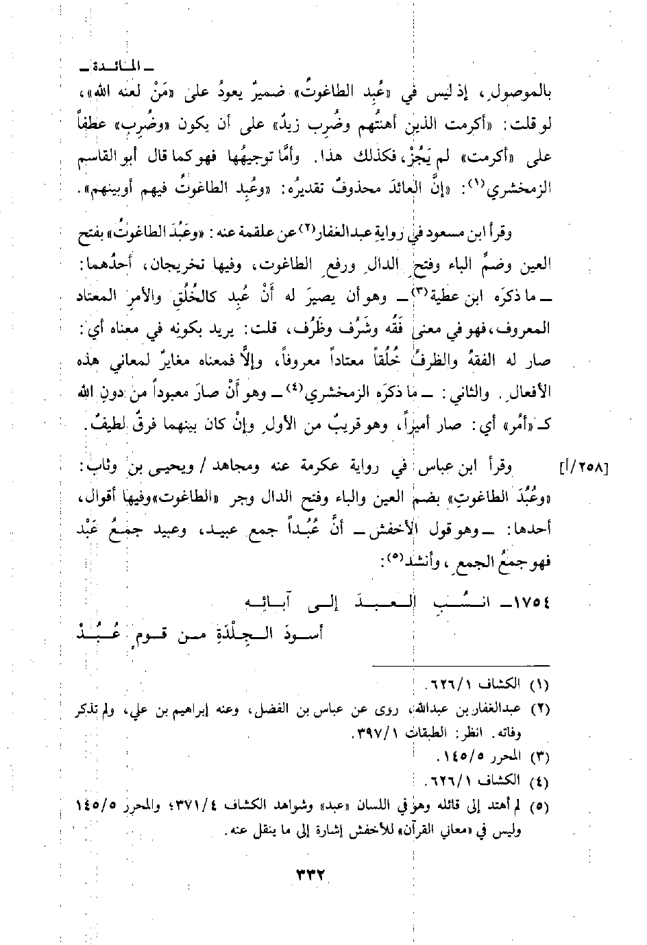 وقرأ ابن عباس في رواية عكرمة عنه ومجاهد / ويحيى بن وثاب: و {وعُبُدَ الطاغوتِ} بضم العين والباء وفتح الدال وجر «الطاغوت» وفيها أقوال، أحدها: وهو قول الأخفش - أنَّ عُبُداً جمع عبيد، وعبيد جمعُ عَبْد فهو جمعٌ الجمعِ، وأنشد: