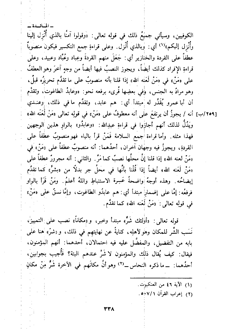 الكوفيين، وسيأتي جميعُ ذلك في قولِه تعالى: {وقولوا آمَنَّا بالذي أُنزِلَ إِلَيْنَا وَأُنزِلَ إِلَيْكُمْ} [العنكبوت: 46] أي: وبالذي أُنْزل. وعلى قراءةِ جمع التكسير فيكون منصوباً عطفاً على القردة والخنازير أي: جَعَلَ منهم القردةَ وعِباد وعُبَّاد وعبيد، وعلى قراءةِ الإِفراد كذلك أيضاً، ويجوز النصبُ فيها أيضاً من وجهٍ آخرَ وهو العطفُ على» مَنْ «في {مَن لَّعَنَهُ الله} إذا قلنا بأنه منصوبٌ على ما تقدَّم تحريرُه قبلُ، وهو مرادٌ به الجنس، وفي بعضِها قُرئ برفعه نحو:» وعابدُ الطاغوت، وتقدَّم أن أبا عمرو يُقَدِّر له مبتدأ أي: هم عابد، وتقدَّم ما في ذلك، وعندي أنه يجوزُ ان يرتفعَ على أنه معطوفٌ على «مَنْ» في قولِه تعالى {مَن لَّعَنَهُ الله} ويَدُلُّ لذلك أنهم أجازوا في قراءِة عبدِ الله: «وعابدُو» بالواوِ هذين الوجهين فهذا مثله.