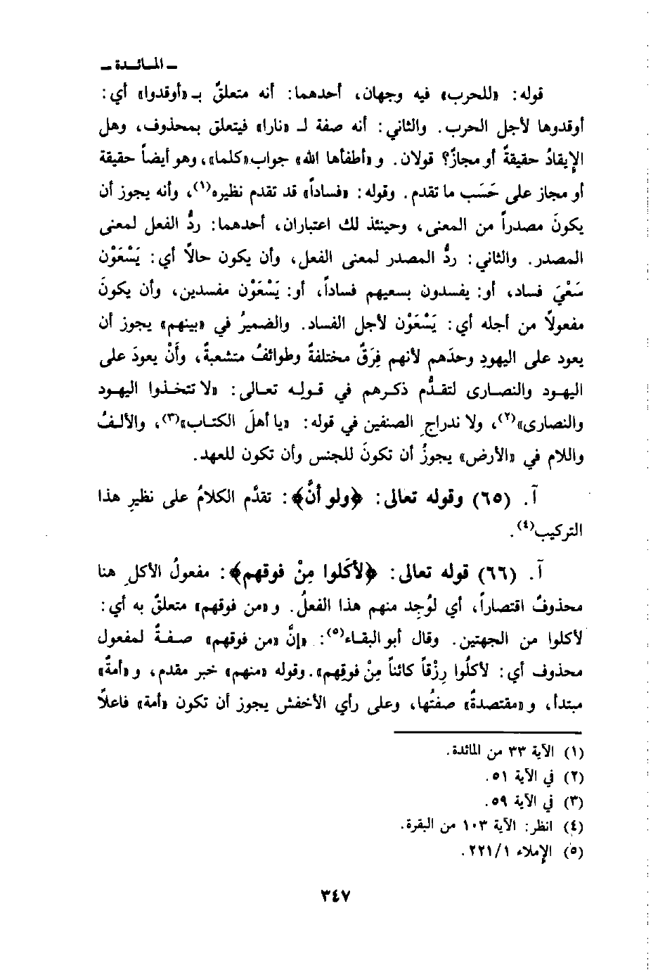 قوله: {لِّلْحَرْبِ} فيه وجهان أحدهما: أنه متعلقٌ ب «أوقدوا» أي: أوقدوها لأجل الحرب. والثاني: أنه صفة ل «نارا» فيتعلق بمحذوف، وهل الإِيقادُ حقيقةٌ أو مجازٌ؟ قولان. و «أطفأها الله» جواب «كلما» وهو أيضاً حقيقة أو مجاز على حَسَب ما تقدم. وقوله: {فَسَاداً} [المائدة: 33] قد تقدم نظيره، وأنه يجوز أن يكونَ مصدراً من المعنى، وحينئذ لك اعتباران، أحدهما: ردُّ الفعل لمعنى المصدر. والثاني: ردُّ المصدر لمعنى الفعل، وأن يكون حالاً أي: يَسْعَوْن سَعْيَ فساد، أو: يفسدون بسعيهم فساداً، أو: يَسْعَوْن مفسدين، وأن يكونَ مفعولاً من أجله: أي: يَسْعَوْن لأجل الفساد. والضميرُ في «بينهم» يجوز أن يعود على اليهودِ وحدَهم لأنه فِرَقٌ مختلفةٌ وطوائفُ متشعبةٌ، وأَنْ يعودَ على اليهود والنصارى لتقدُّم ذكرهم في قولِه تعالى: {لاَ تَتَّخِذُواْ اليهود والنصارى} [المائدة: 51] ، ولا ندراجِ الصنفين في قوله: {قُلْ ياأهل الكتاب} [المائدة: 59] ، والألفُ واللام في «الأرض» يجوزُ أن تكونَ للجنس وأن تكون للعهد.