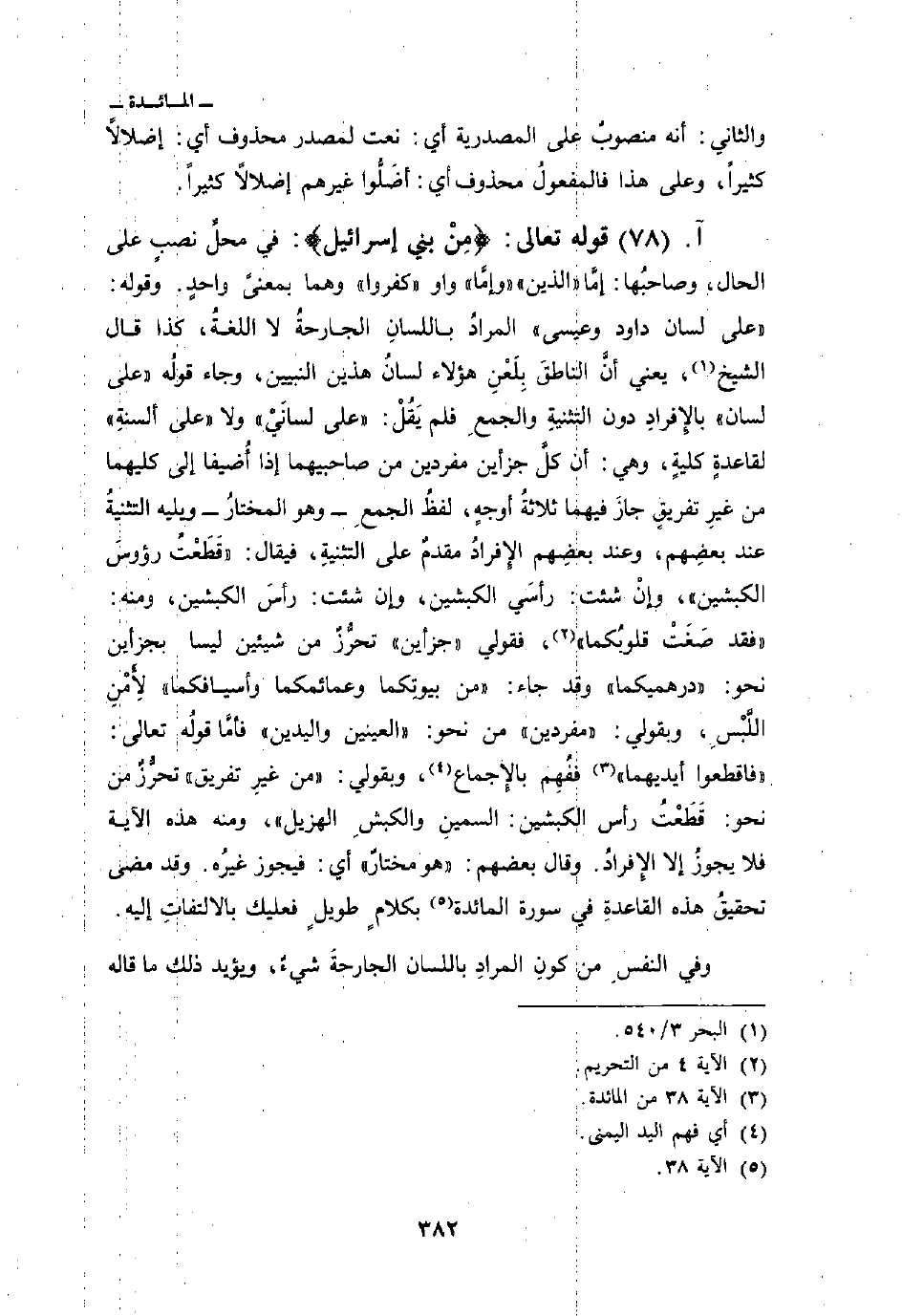 قوله تعالى: {مِن بني إِسْرَائِيلَ} : في محلِّ نصبٍ على الحال، وصاحبُها: إمَّا «الذين» وإمَّا «واو» كفروا «وهم بمعنًى واحدٍ. وقوله: {على لِسَانِ دَاوُودَ وَعِيسَى} المرادُ باللسانِ الجارحةُ لا اللغةُ، كذا قال الشيخ يعني أنَّ الناطقَ بِلَعْنِ هؤلاء لسانُ هذين النبيين، وجاء قولُه {على لِسَانِ} بالإِفراد دون التثنيةِ والجمعِ فلم يَقُلْ:» على لسانَيْ «ولا» على ألسنةِ «لقاعدةٍ كليةٍ، وهي: أن كلَّ جزأين مفردين من صاحبيهما إذا أُضيفا إلى كليهما من غيرِ تفريقٍ جازَ فيهما ثلاثةُ أوجهٍ، لفظُ الجمعِ - وهو المختارُ - ويليه التثنيةُ عند بعضِهم، وعند بعضِهم الإِفرادُ مقدمٌ علة التثنيةِ، فيقال:» قَطَعْتُ رؤوسَ الكبشين «وإنْ شئت: رأسَي الكبشين، وإن شئت: رأسَ الكبشين، ومنه: {فَقَدْ صَغَتْ قُلُوبُكُمَا} [التحريم: 4] ، فقولي» جزأين «تحرُّزٌ من شيئين ليسا بجزأين نحو:» درهميكما «وقد جاء:» من بيوتِكما وعمائمكما وأسيافمكا «لأَمْنِ اللَّبْسِ، وبقولي:» مفردين «من نحو:» العينين واليدين «فأمَّا قولُه تعالى: {فاقطعوا أَيْدِيَهُمَا} [المائدة: 38] ففُهِم بالإِجماع وبقولي:» من غيرِ تفريق «تحرُّزٌ من نحو: قَطَعْتُ رأسي الكبشين: السمينِ والكبشِ الهزيل» ، ومنه هذه الآية فلا يجوزُ إلا الإِفرادُ وقال بعضهم: «وهو مختارٌ» أي: فيجوز غيرُه. وقد مضى تحقيقُ هذه القاعدةِ في سورة المائدة بكلامٍ طويٍ فعليك بالالتفاتِ إليه.