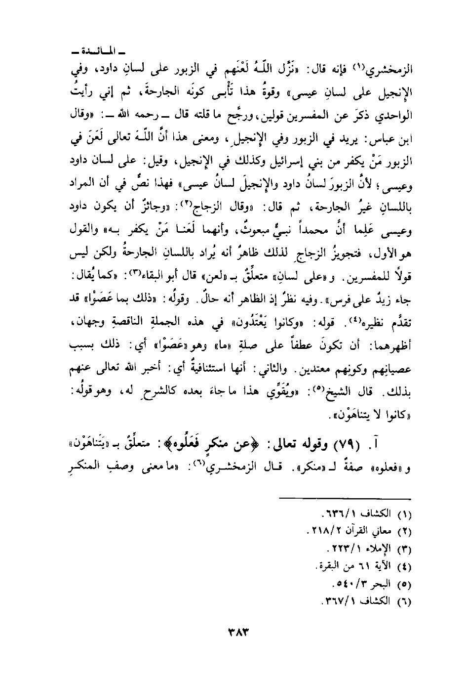 الزمخشري فإنه قال: «نَزَّل اللهُ لَعْنَهم في الزبور على لسانِ داود، وفي الإِنجيل على لسانِ عيسى وقوةُ هذا تَأْبى كونَه الجارحةَ، ثم أني رأيتُ الواحدي ذكرَ عن المفسرين قولين، ورجَّح ما قلته قال - رحمه الله -:» وقال ابن عباس: يريد في الزبور وفي الإِنجيلِ، ومعنى هذا أنَّ اللَهَ تعالى لَعَنَ في الزبور مَنْ يكفر من بني إسرائيل وكذلك في الإِنجيل، وقيل: على لسان داود وعيسى؛ لأنَّ الزبورَ لسانُ داود والإِنجيلَ لسانُ عيسى «فهذا نصٌّ في أن المراد باللسانِ غيرُ الجارحة، ثم قال:» وقال الزجاج: «وجائزٌ أن يكون داود وعيسى عَلِما أنَّ محمداً نبيٌّ مبعوثٌ، وأنهما لَعَنا مَنْ يكفر به» والقول هو الأول، فتجويزُ الزجاجِ لذلك ظاهرٌ أنه يُراد باللسانِ الجارحةُ ولكن ليس قولاً للمفسرين. و «على لسانِ» متعلِّقٌ ب «لعن» قال أبو البقاء: «كما يُقال: جاء زيدٌ على فرس» . وفيه نظرٌ إذ الظاهر أنه حالٌ. وقولُه: «ذلك بما عَصَوْا» قد تقدَّم نظيره قوله: {وَّكَانُواْ يَعْتَدُونَ} في هذه الجملة الناقصةِ وجهان، أظهرهما: أن تكونَ عطفاً على صلةِ «ما» وهو «عَصَوْا» أي: ذلك بسب عصيانِهم وكونِهم معتدين. والثاني: أنها استئنافيةٌ أي: أخبر الله تعالى عنهم بذلك. قال الشيخ: «ويُقَوِّي هذا ما جاءَ بعده كالشرحِ له، وهو قولُه: {كَانُواْ لاَ يَتَنَاهَوْنَ} .